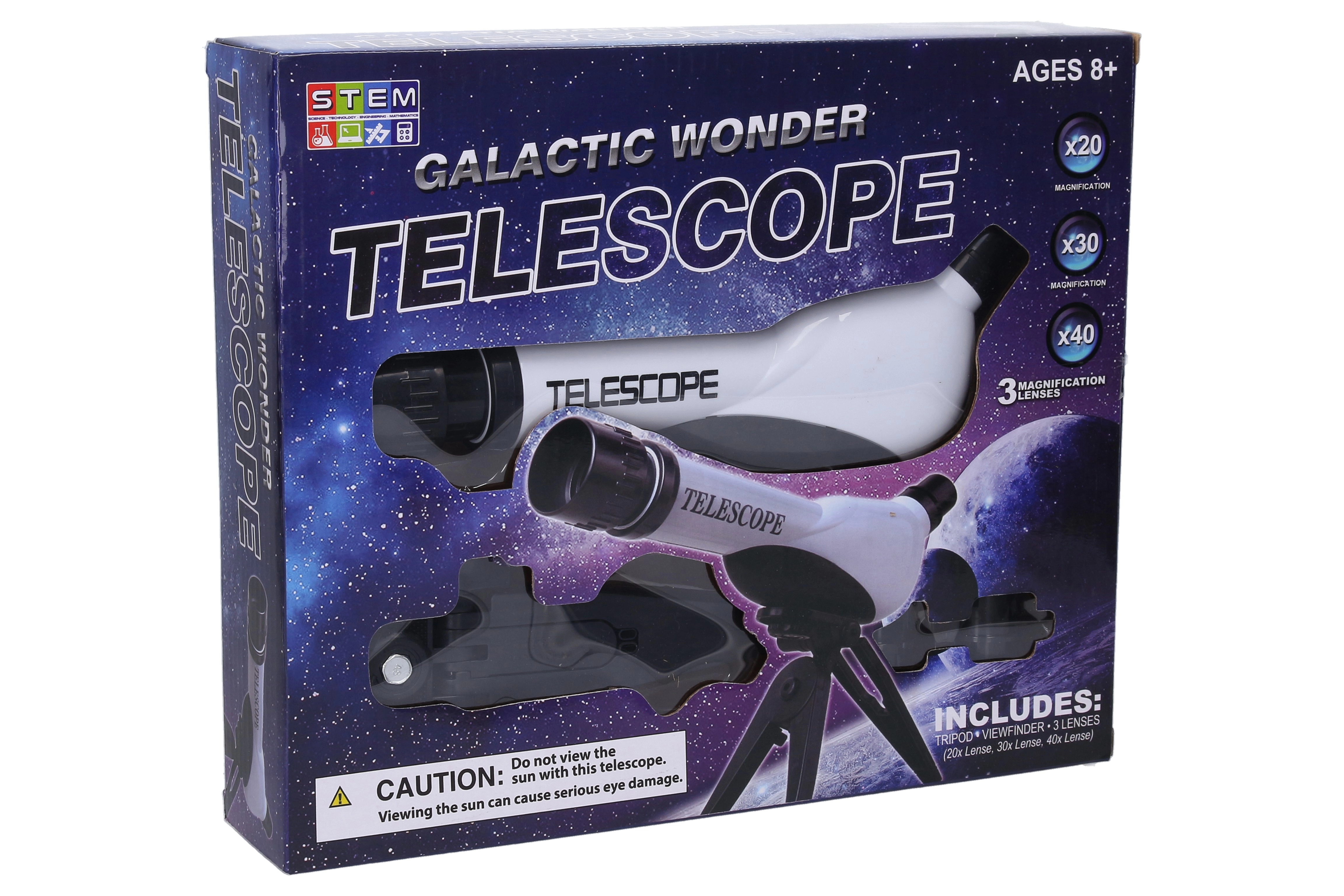 Ontdek de nachtelijke hemel met deze compacte astronomische telescoop voor beginners en nieuwsgierige kinderen. Biedt 20×, 30× en 40× vergroting, verwisselbare lenzen voor verschillende niveaus van vergroting en een stabiel statief voor comfortabel observeren. Eenvoudig focussen door de objectieflens te draaien maakt een scherp beeld gemakkelijk, dat bij het kijken door de telescoop in spiegelbeeld is (optische eigenschap).