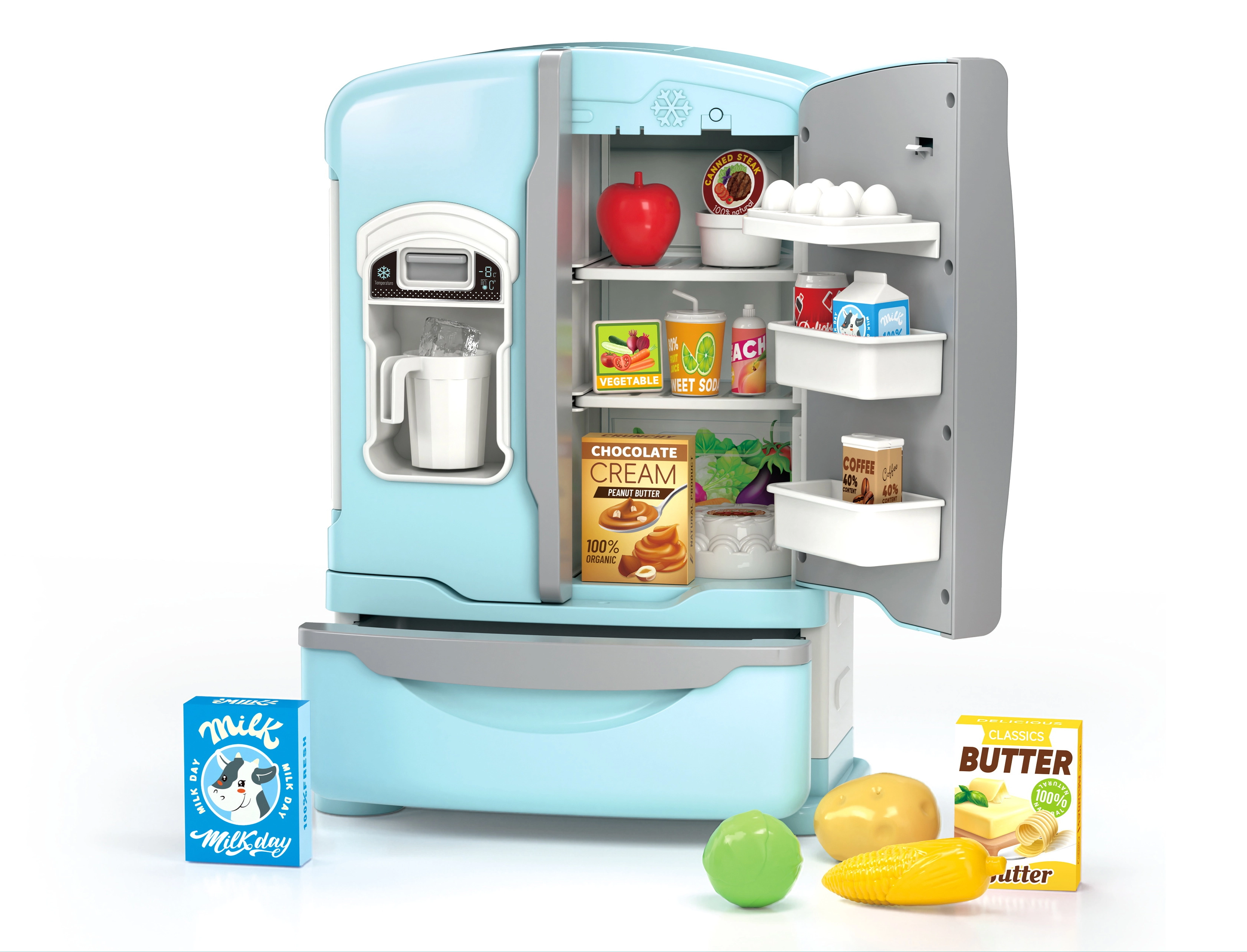 Een leuke kinderkoelkast van 26,5 cm met realistische licht- en geluidseffecten, een handige aan/uit-schakelaar en een magische nevelfunctie bij het openen. Giet gewoon water in de opening bovenaan en het spel kan beginnen. Batterijen 3× AAA zijn niet inbegrepen.