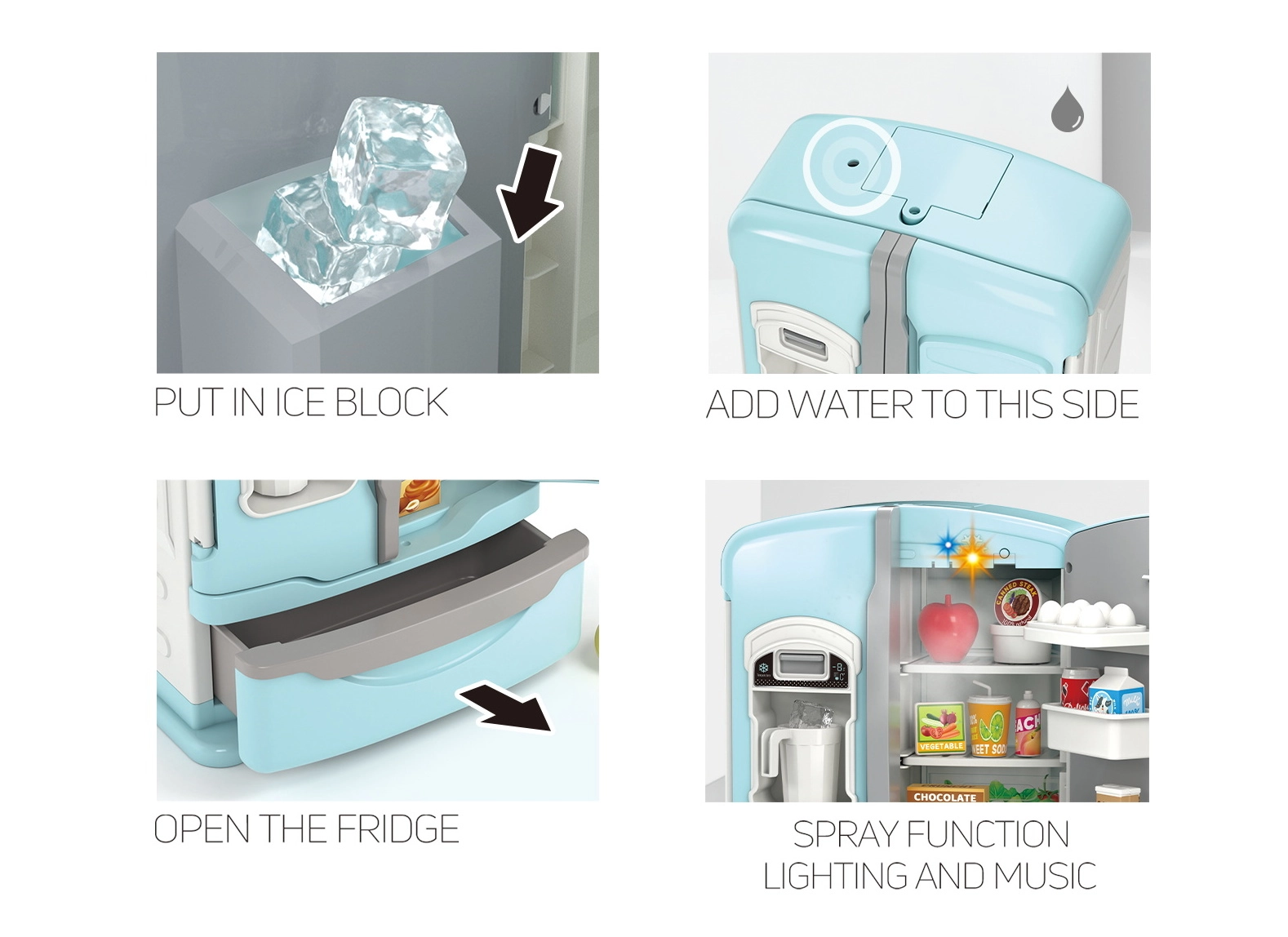 Deze kinderkoelkast is een geweldige aanvulling op elke kinderkookhoek. Na het gieten van water in de opening bovenaan en het openen van het deurtje ontstaat een aantrekkelijk neveleffect, dat samen met het LED-licht en de geluidseffecten de fantasie en het speelplezier bij rollenspellen stimuleert.