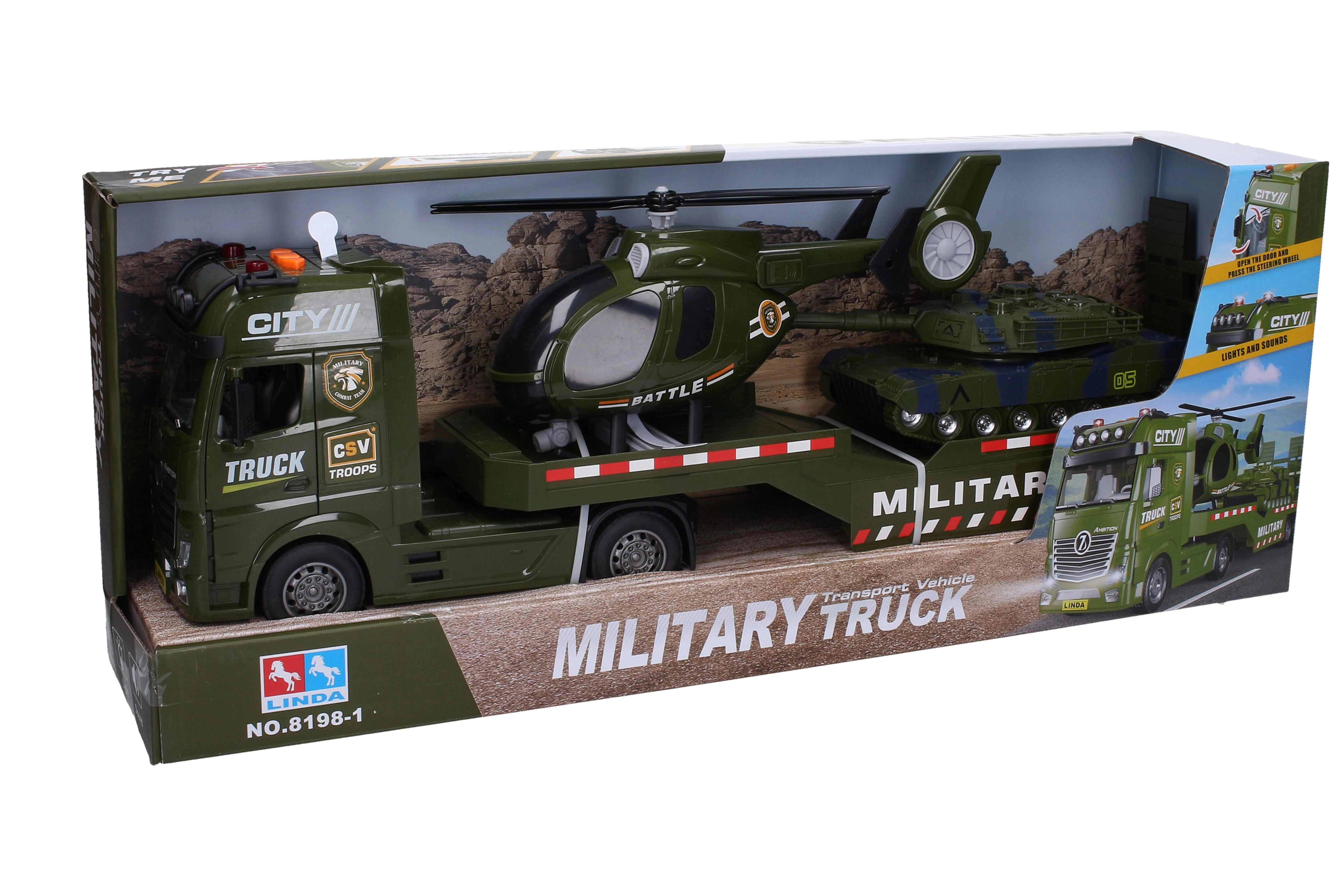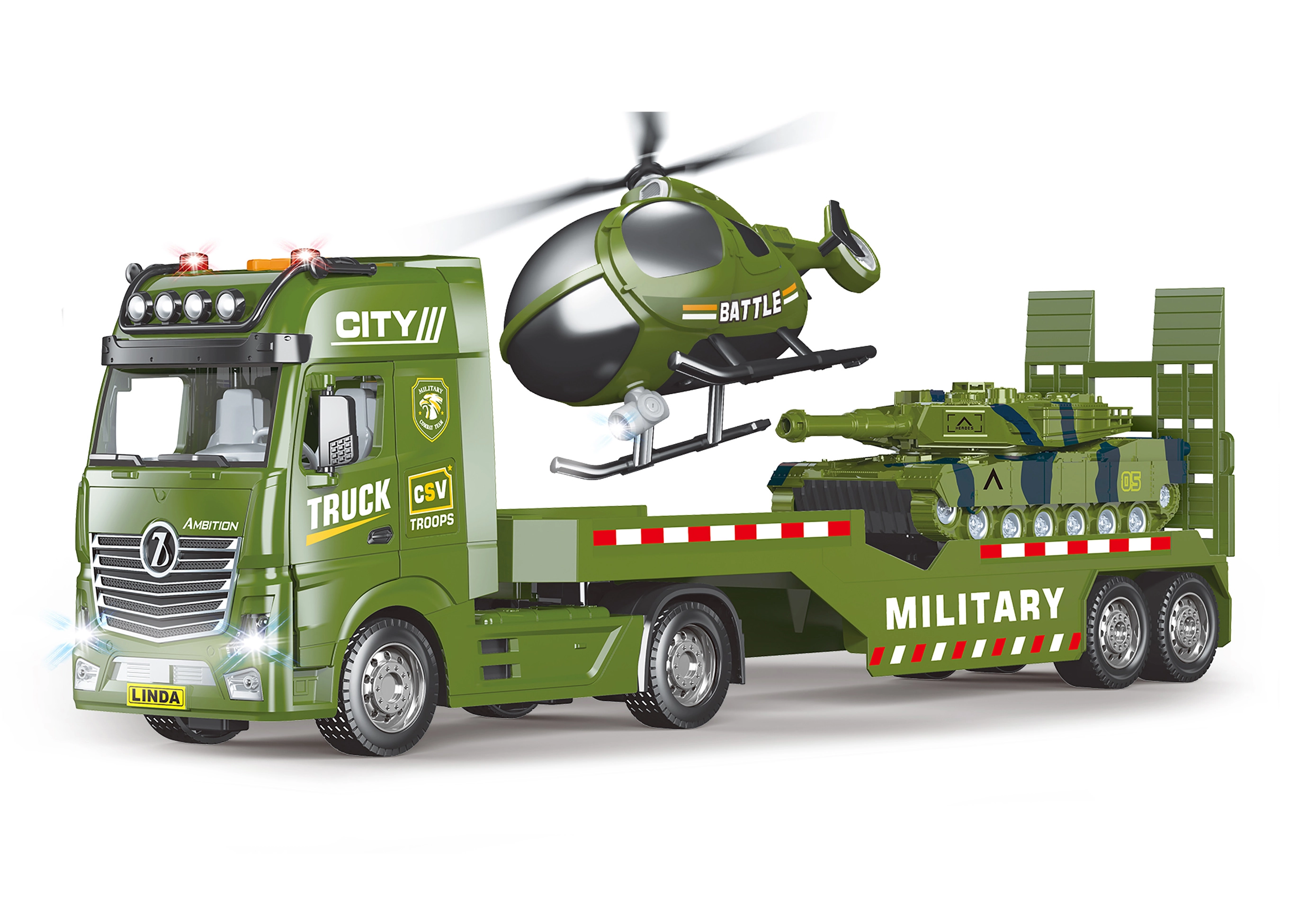Realistische set voor kleine fans van legermateriaal: militaire autotransporteur 55 cm met een helikopter 27 cm en een tank 22 cm. Zowel de transporteur als de helikopter bieden licht- en geluidseffecten, geactiveerd via knoppen, en de transporteur rijdt op een frictiemotor. Batterijen zijn bijgevoegd, dus het speelplezier kan meteen beginnen.