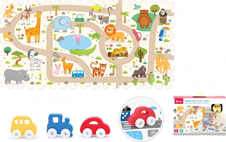 Ontdek leuk en veilig spelen met deze set zachte blokken en een safari-autootje. De set bevat 8 zachte blokken met afmetingen van 31,5 × 31,5 × 1 cm en een autootje met vrijlopende wielen, dat creativiteit, motoriek en veilig spel thuis en in de kleuterklas stimuleert.