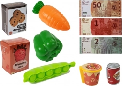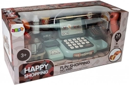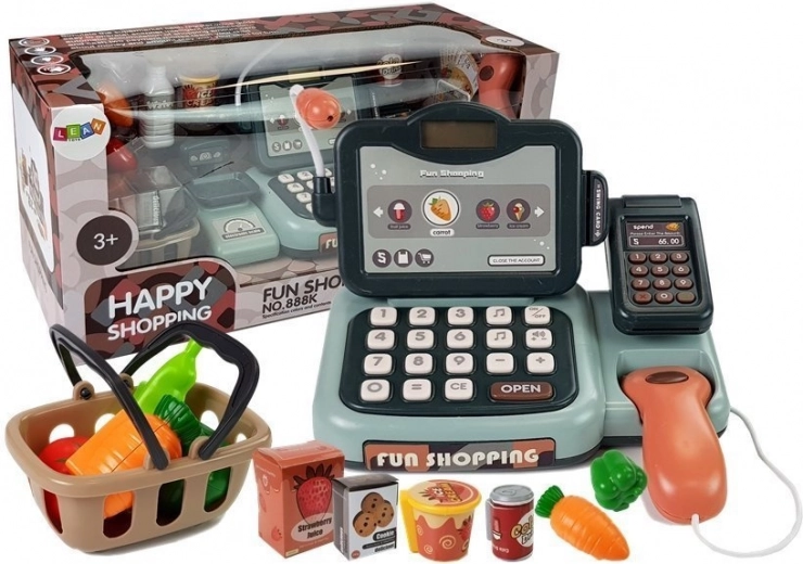 In de doos vind je alles wat je nodig hebt: kassa met weegschaal en kaartlezer, handscanner, mandje, speelgoed-eten (koekjes, sap, water, ijs, cola, groente), betaalkaart, bankbiljetten en 6 plastic munten. Het spel is zo maximaal realistisch en stimuleert de fantasie en fijne motoriek.