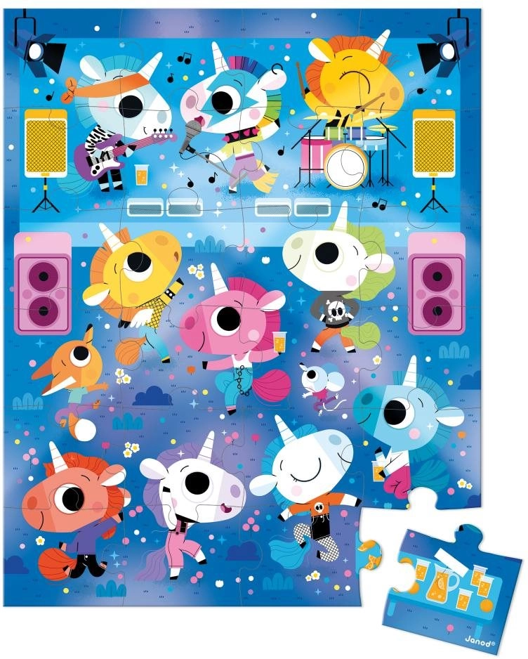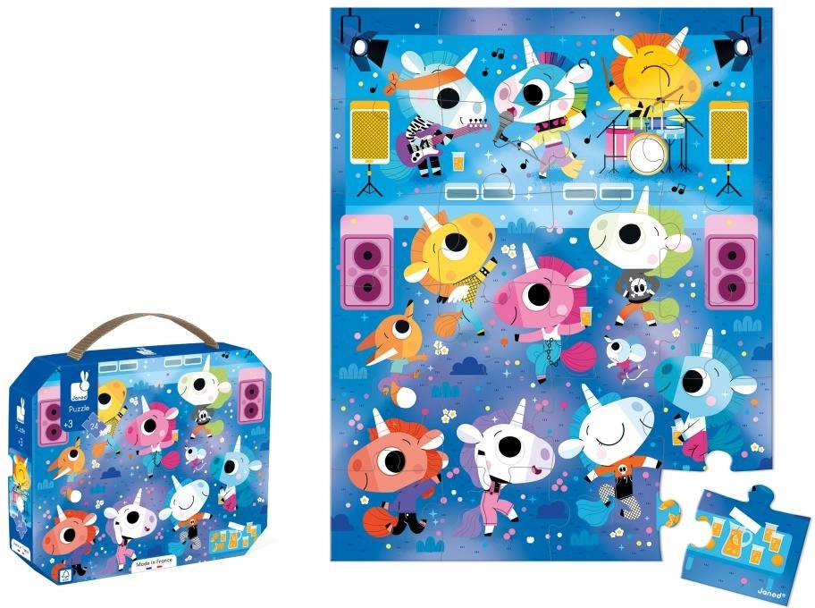 Ontdek de charmante puzzel in koffer van Janod met het thema concert van eenhoorns. Dankzij de 24 stevige stukjes leggen kinderen gemakkelijk een grote afbeelding van ca. 50 × 40 cm. De praktische kartonnen koffer met handvat is ideaal voor thuis en onderweg en houdt alle stukjes bij elkaar.