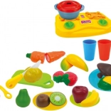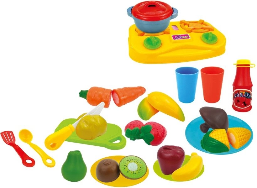 De praktische mand maakt opbergen en meenemen eenvoudig, waardoor de set geschikt is voor zowel thuis spelen als onderweg. De set biedt realistisch kookspel, ondersteunt rollenspel en het herkennen van kleuren en vormen.