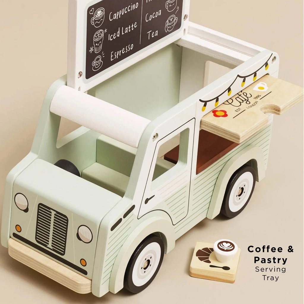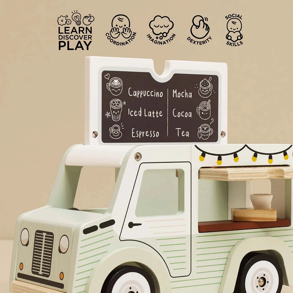Ontdek de charme van een rijdende koffiekar in kindformaat. De Le Toy Van Street Coffee mobiele koffiekar valt op door zijn zachte pistachegroene en witte kleur, gedetailleerde illustraties en doordachte functies die kinderen meenemen in de wereld van de verbeelding. Het dakje is eenvoudig te openen en binnenin vind je een menu met koffie- en theesuggesties, terwijl het uitgifteraampje aan de voorkant kinderen in staat stelt “klanten” te bedienen zoals in een echt café.