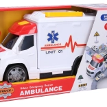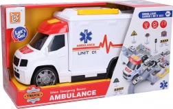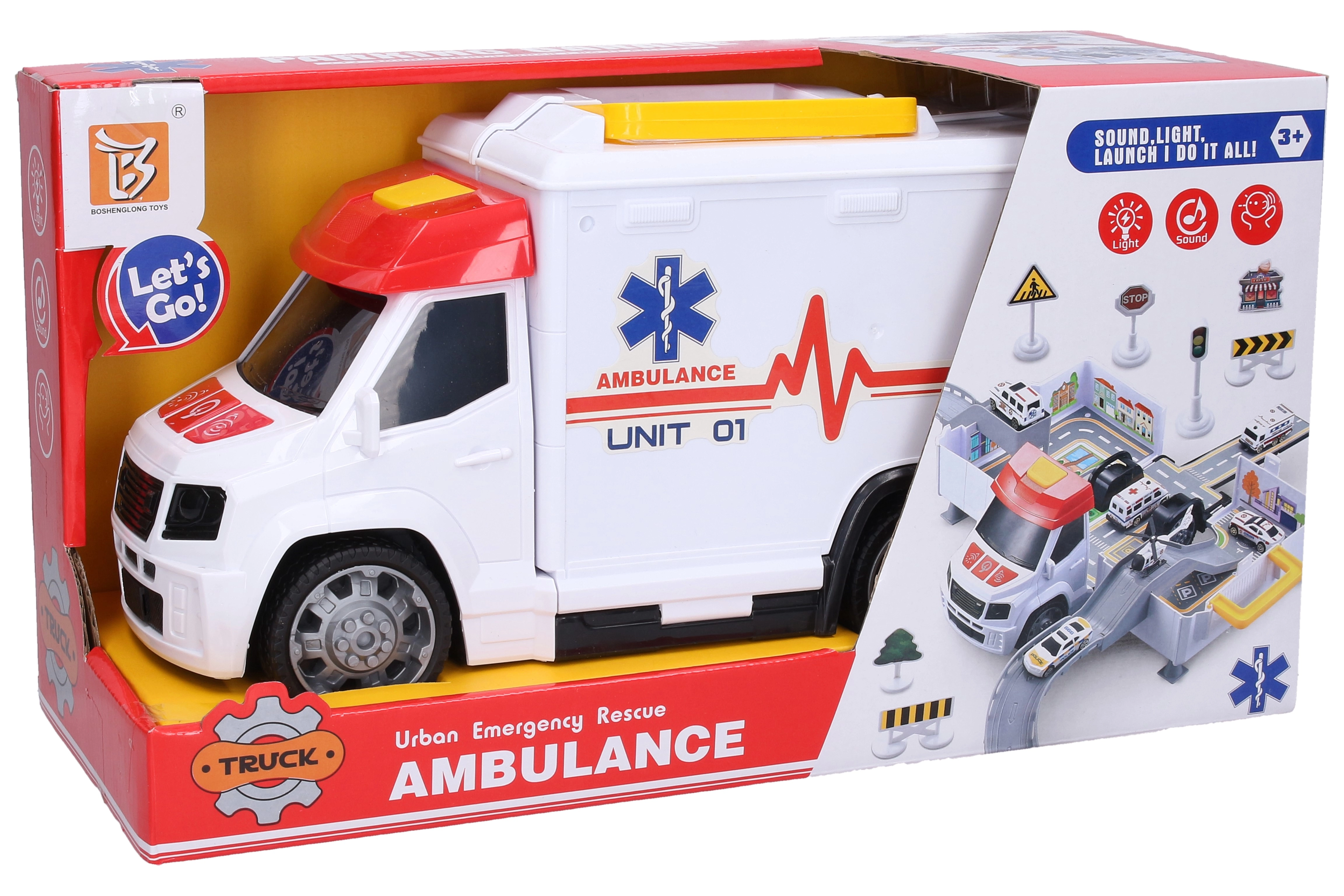 Een leuke en realistische ambulance met uitklapbare ziekenhuisschuur biedt kinderen uren speelplezier. Voorzien van licht- en geluidseffecten, geactiveerd via knoppen op de motorkap en een grote knop op het dak voor ontgrendeling. Voeding via 3× AG13 is inbegrepen. Vrije wielen zorgen voor soepel rijden en na uitklappen ontstaat een ziekenhuis-speelgebied met autootjes en verkeersborden.