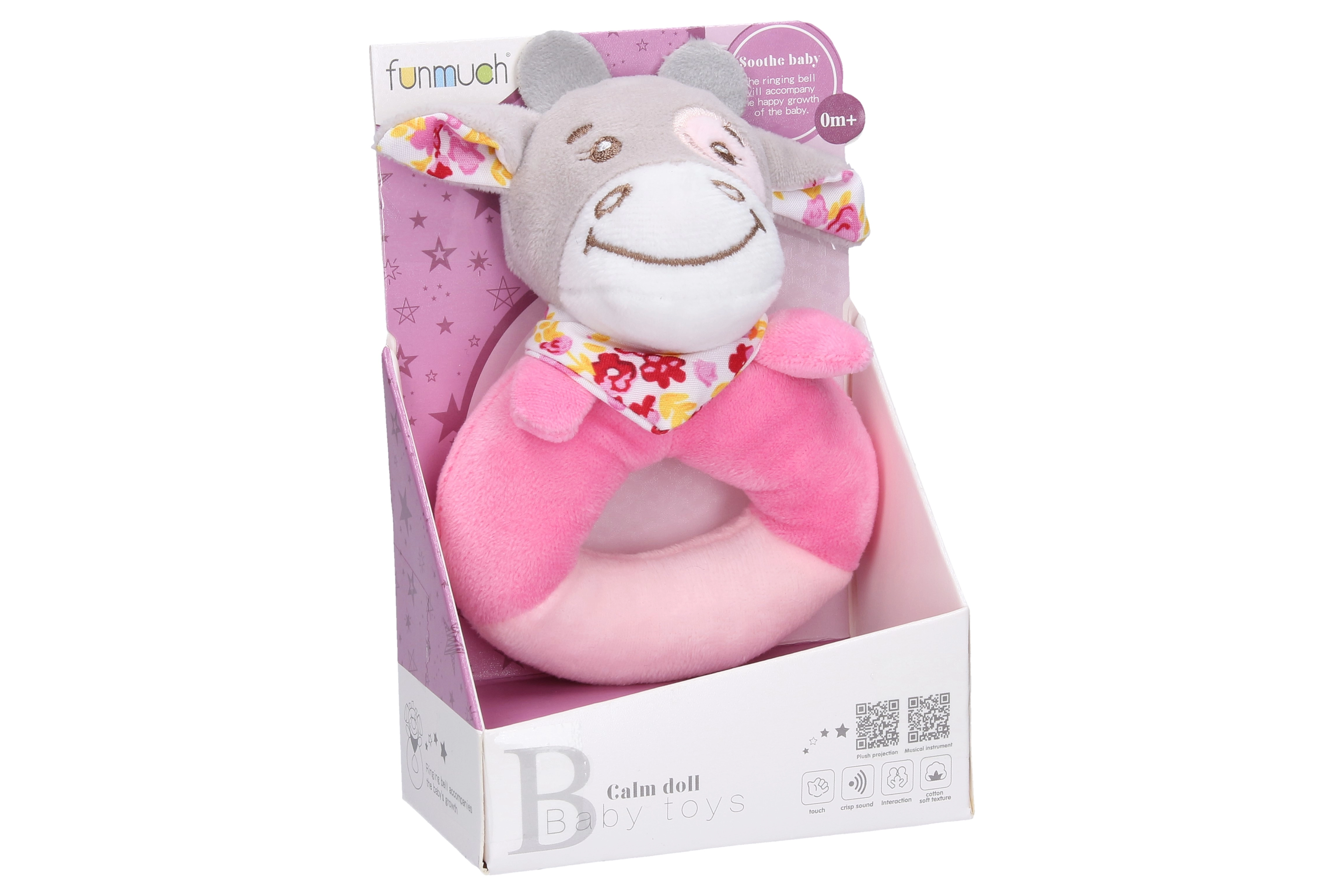 Schattige pluchen rammelaar in ringvorm met koemotief, die baby’s blij maakt met zijn zachtheid en aangenaam geluid. Ideaal voor de eerste ontdekkingen, grijpen en motorische ontwikkeling. Zachte pluche, makkelijk vast te houden en zacht gerammel stimuleren de zintuigen.