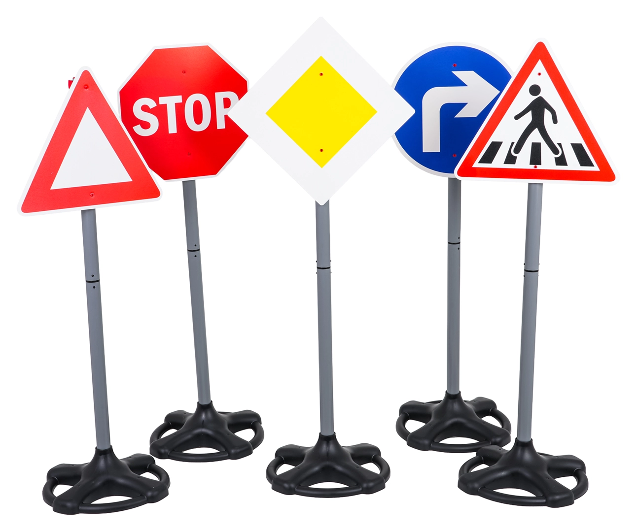 - Inhoud van de set: STOP, Waarschuwing driehoek, Voetgangersoversteekplaats, Hoofdweg (voorrang), Verplichte rijrichting rechts