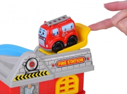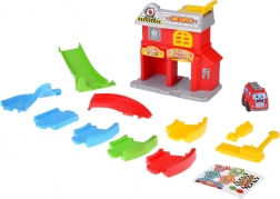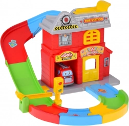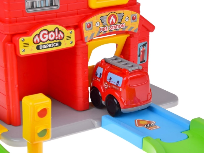 - Brandweerkazerne met openslaande deuren en spiraalbaan, brandweerautootje, slagboom en verkeerslicht
