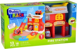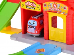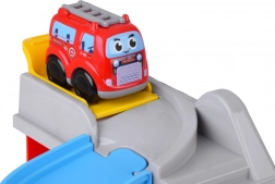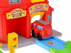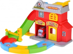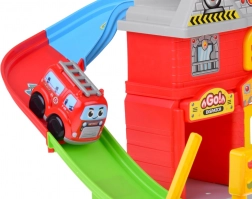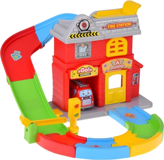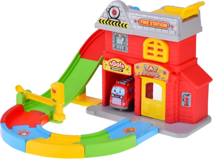 Kleurrijke brandweerkazerne met een bochtige/spiraalvormige helling en een brandweerautootje die kinderen uren plezier en vaardigheidsontwikkeling biedt. De openslaande deuren, startknop op het dak, slagboom en verkeerslicht stimuleren de fantasie, fijne motoriek en het begrip van oorzaak–gevolg.