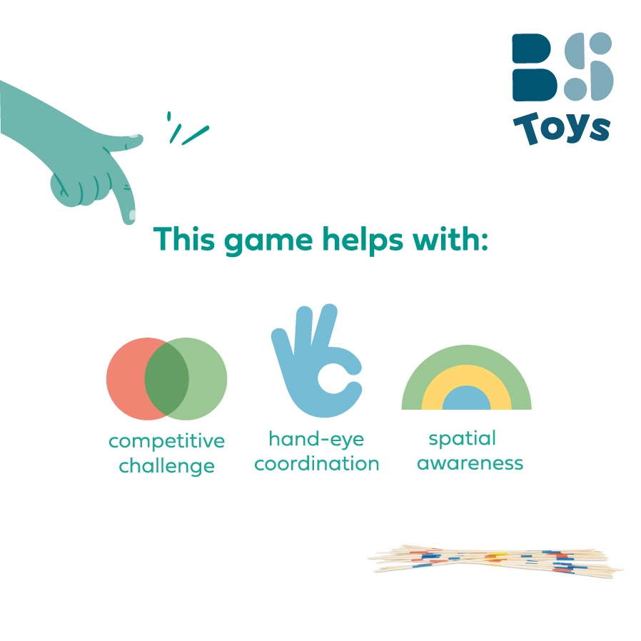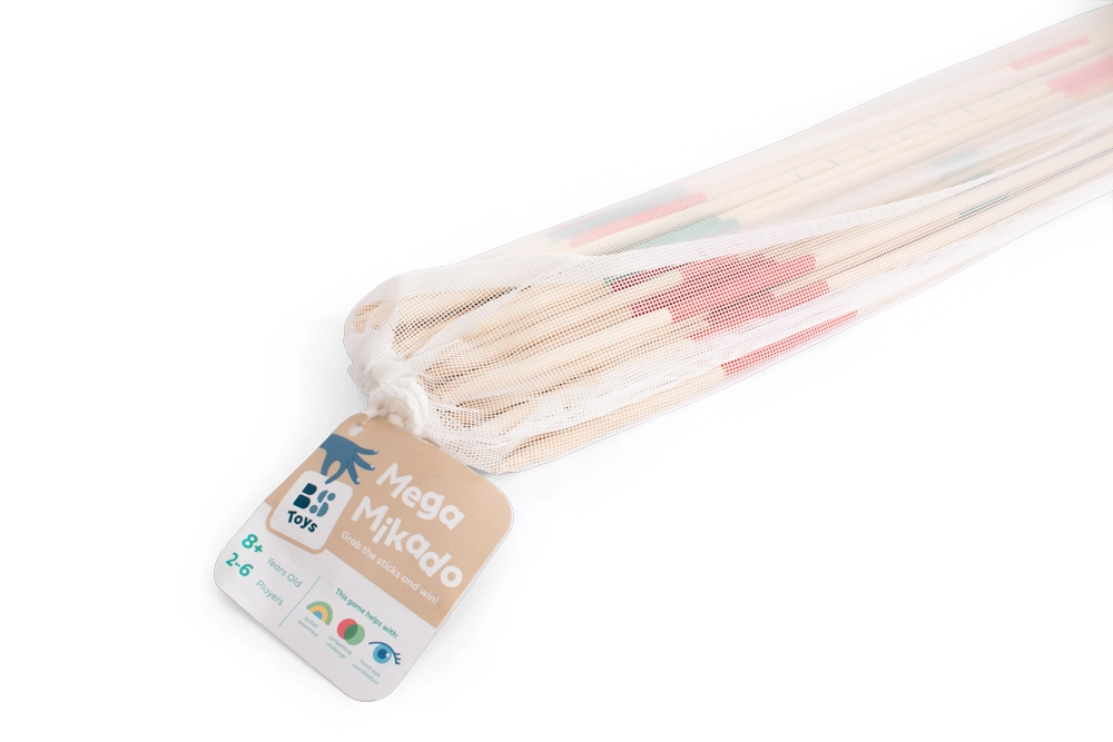 De grotere lengte van de stokken (90 cm) is perfect om te spelen op gras, terras of op school. Natuurlijk bamboe is licht, duurzaam en prettig om vast te houden, waardoor het spel ook voor kinderen goed hanteerbaar is. Mega mikado bevordert concentratie, geduld en ruimtelijk inzicht – een leuke manier om vaardigheden te ontwikkelen.
