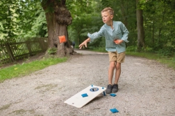 - 21 punten behalen door zakjes op het bord en door de opening te werpen