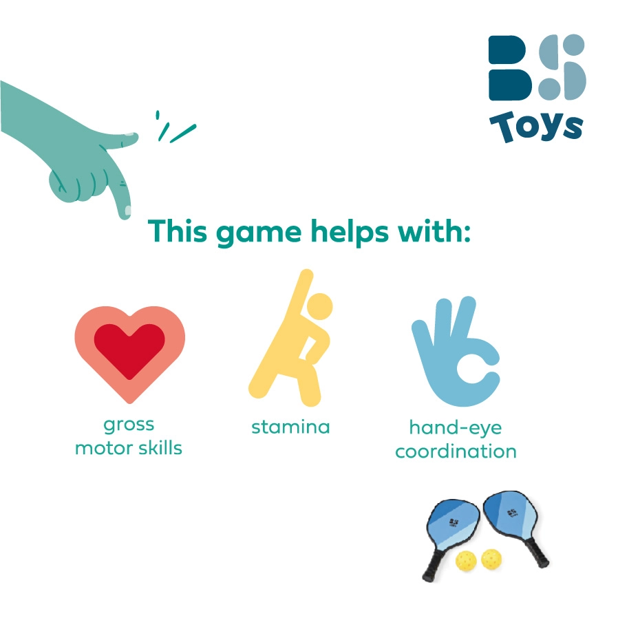Ontdek het leuke rackets spel voor het hele gezin: pickleball. Deze set bevat alles wat je nodig hebt om meteen te spelen – 2 peddels, 2 ballen, een net en een draagtas. Het spel is makkelijk te leren, vriendelijk voor beginners en stimuleert oog-handcoördinatie, uithoudingsvermogen en grove motoriek.