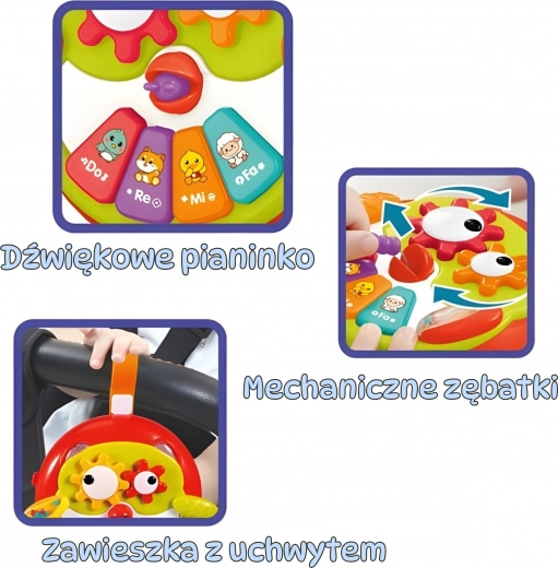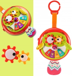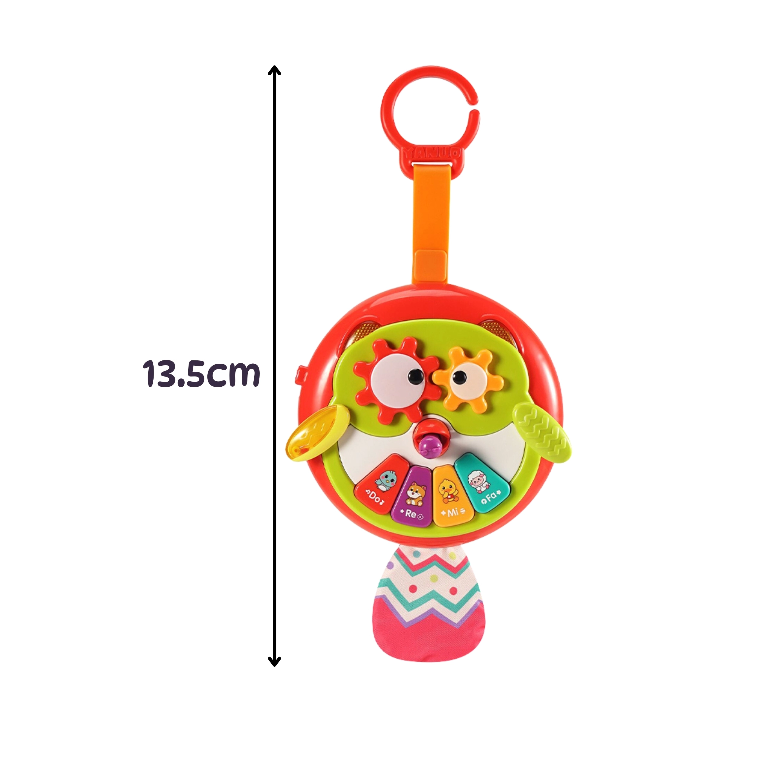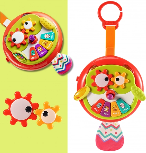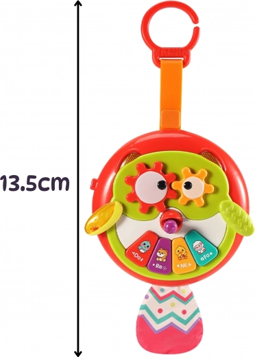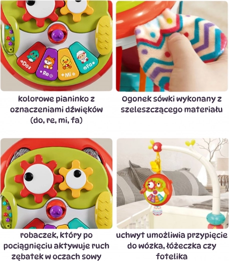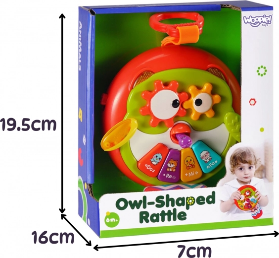 De schattige hangende uil van het merk WOOPIE combineert plezier en leren voor de kleintjes. Hij biedt een kleurrijk pianootje (do, re, mi, fa) met zachte melodieën, rinkelende vleugels, een mechanisch tandwiel in de ogen geactiveerd door een trekbaar “wormpje” en een knisperende staart. Dankzij de praktische clip bevestig je hem eenvoudig aan de kinderwagen, het ledikant of het autostoeltje.