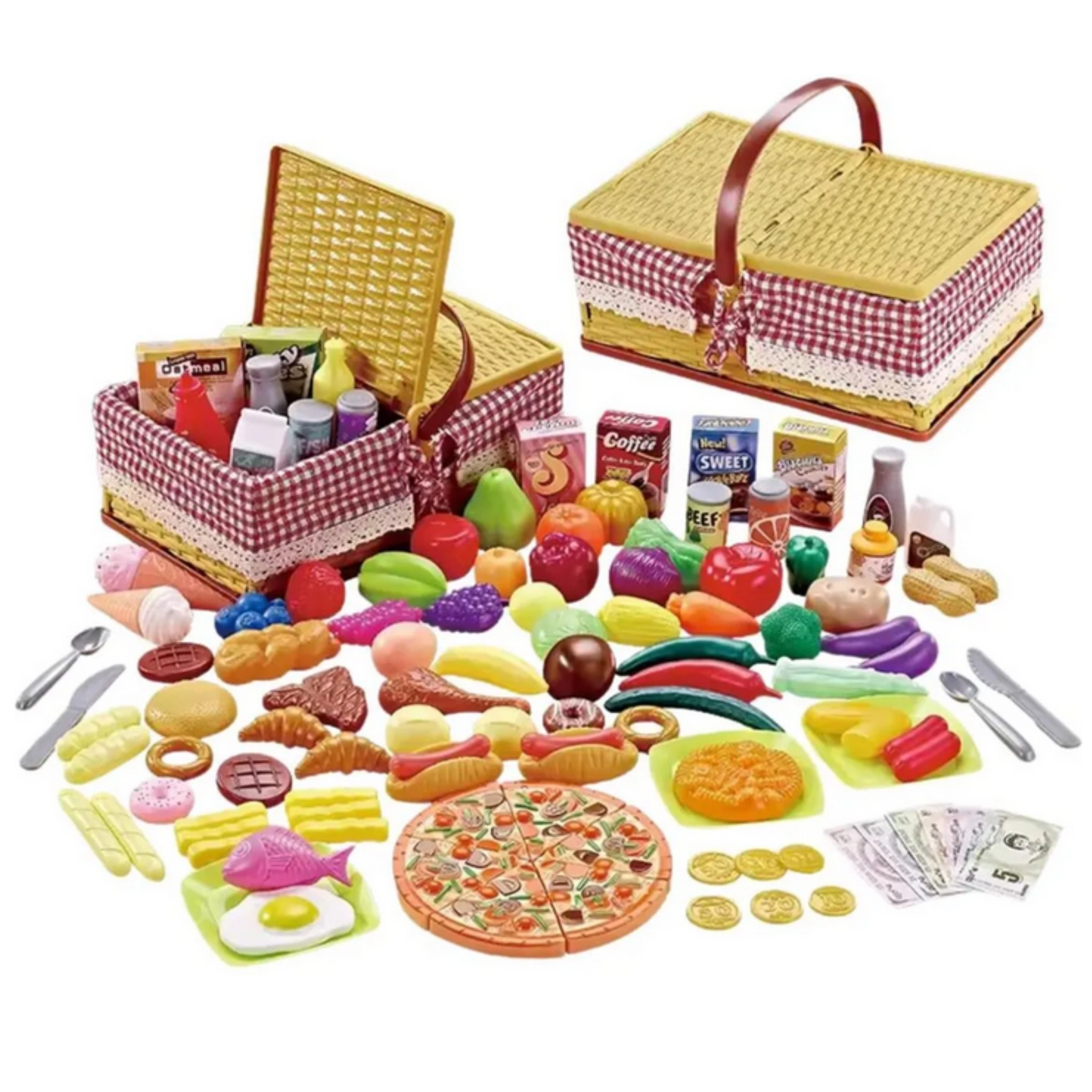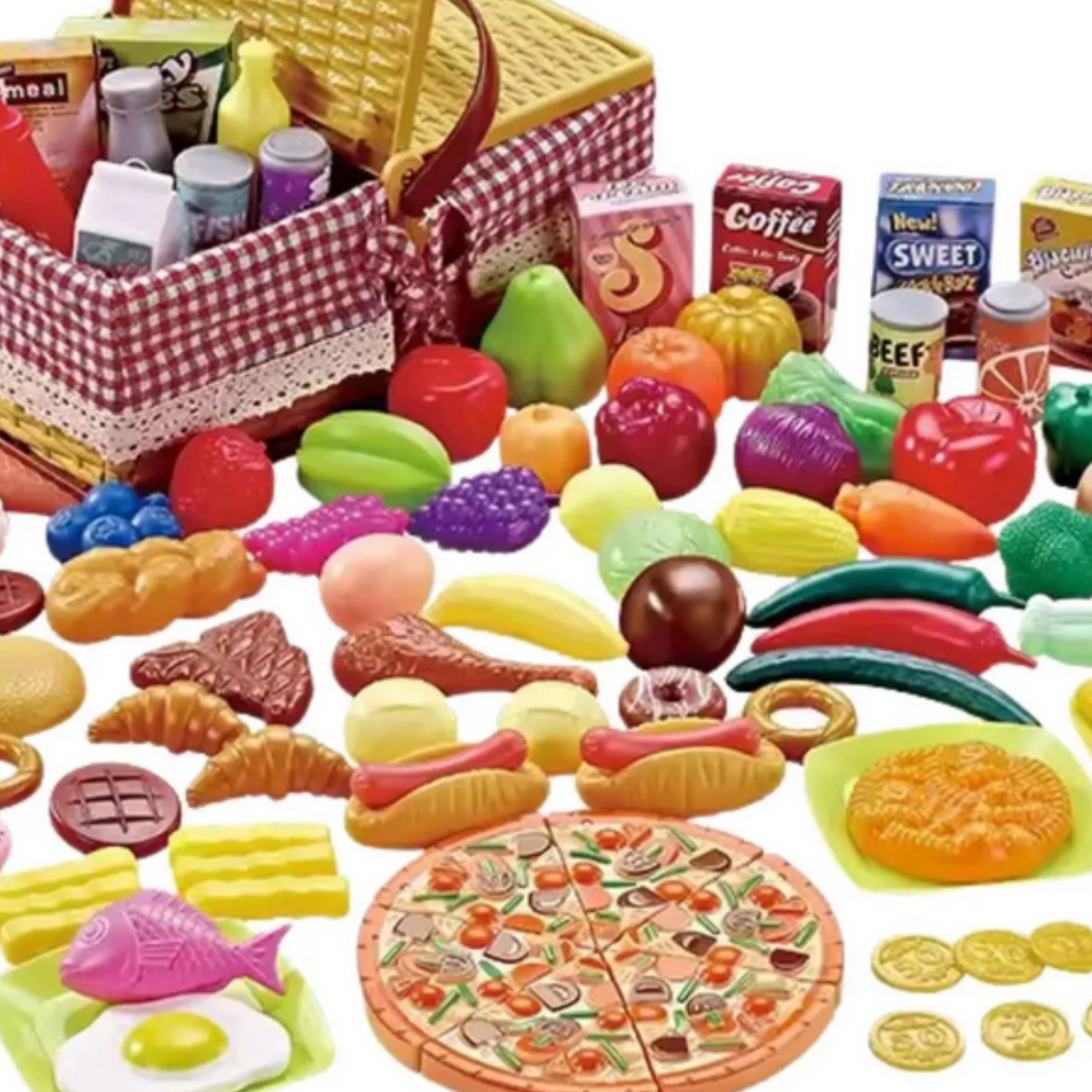 In de doos vind je een kleurrijke selectie etenswaren en accessoires – van pizza in punten tot fruit en groenten, en zelfs desserts, drankjes en bestek. Ook inbegrepen zijn bankbiljetten en munten voor het winkeltje spelen, wat logisch denken en rekenen stimuleert.