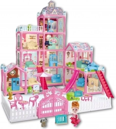 Bouwbaar poppenhuis, pop, hondenfiguurtje, meubels en accessoires, tuintje met hek en poort, trap, glijbaan