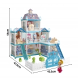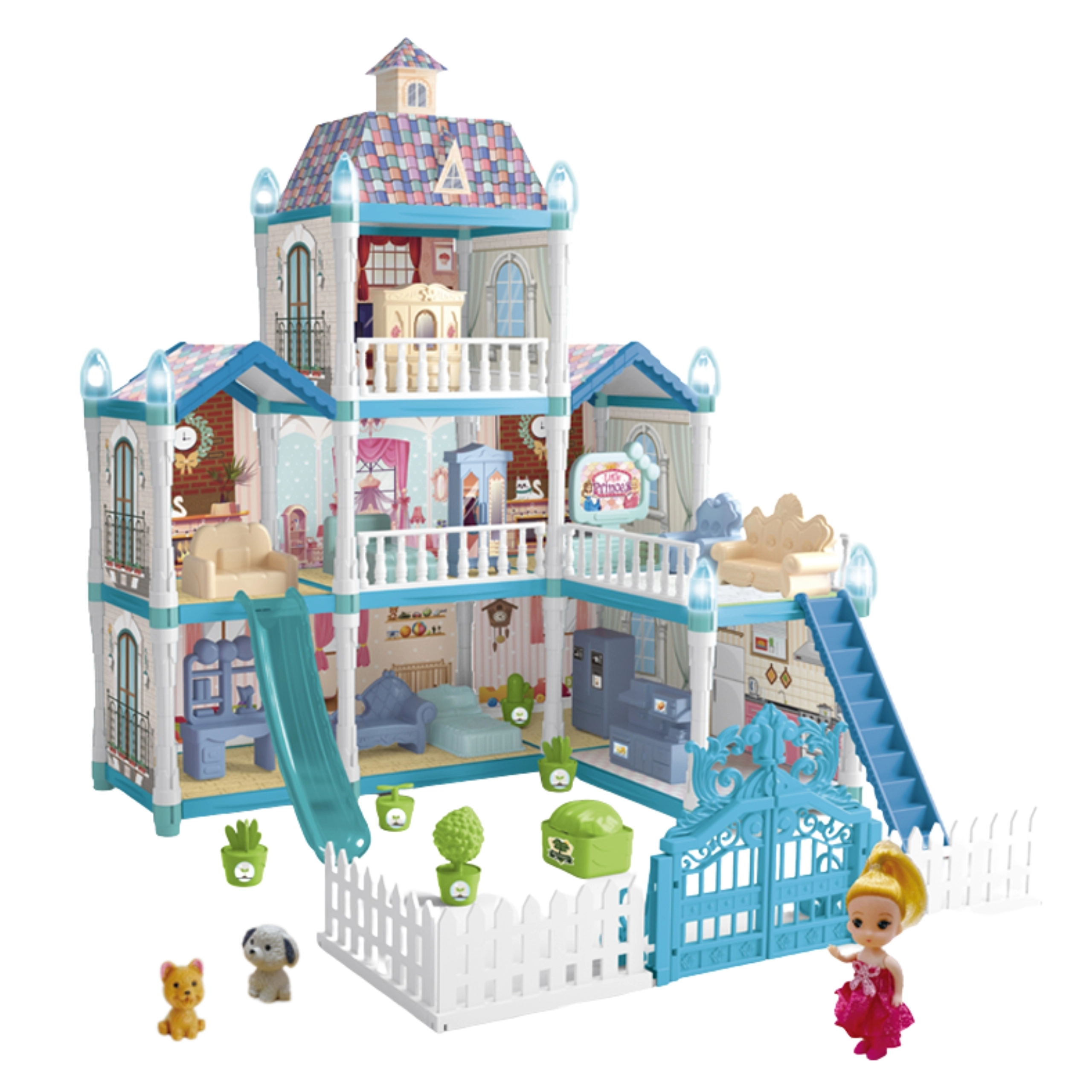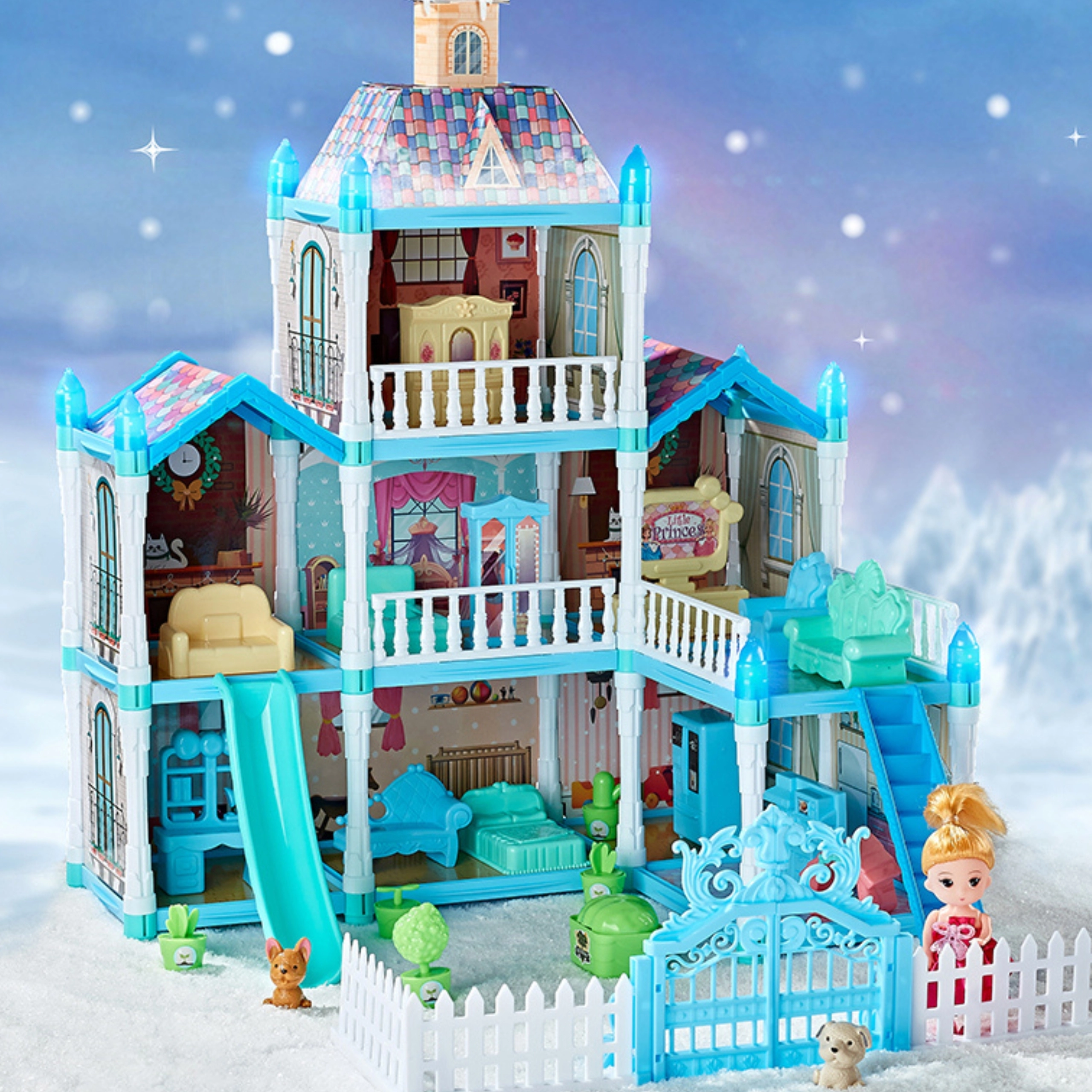 Dit ruime poppenpaleis met drie niveaus zorgt voor uren creatief speelplezier. Met 191 onderdelen kunnen kinderen het interieur ontwerpen, zorgen voor de pop en haar dierenvriendjes, en genieten van verlichte decoraties die het spel ook na zonsondergang laten stralen. De blauw-roze esthetiek roept de sfeer op van een winterkasteel en -tuin.