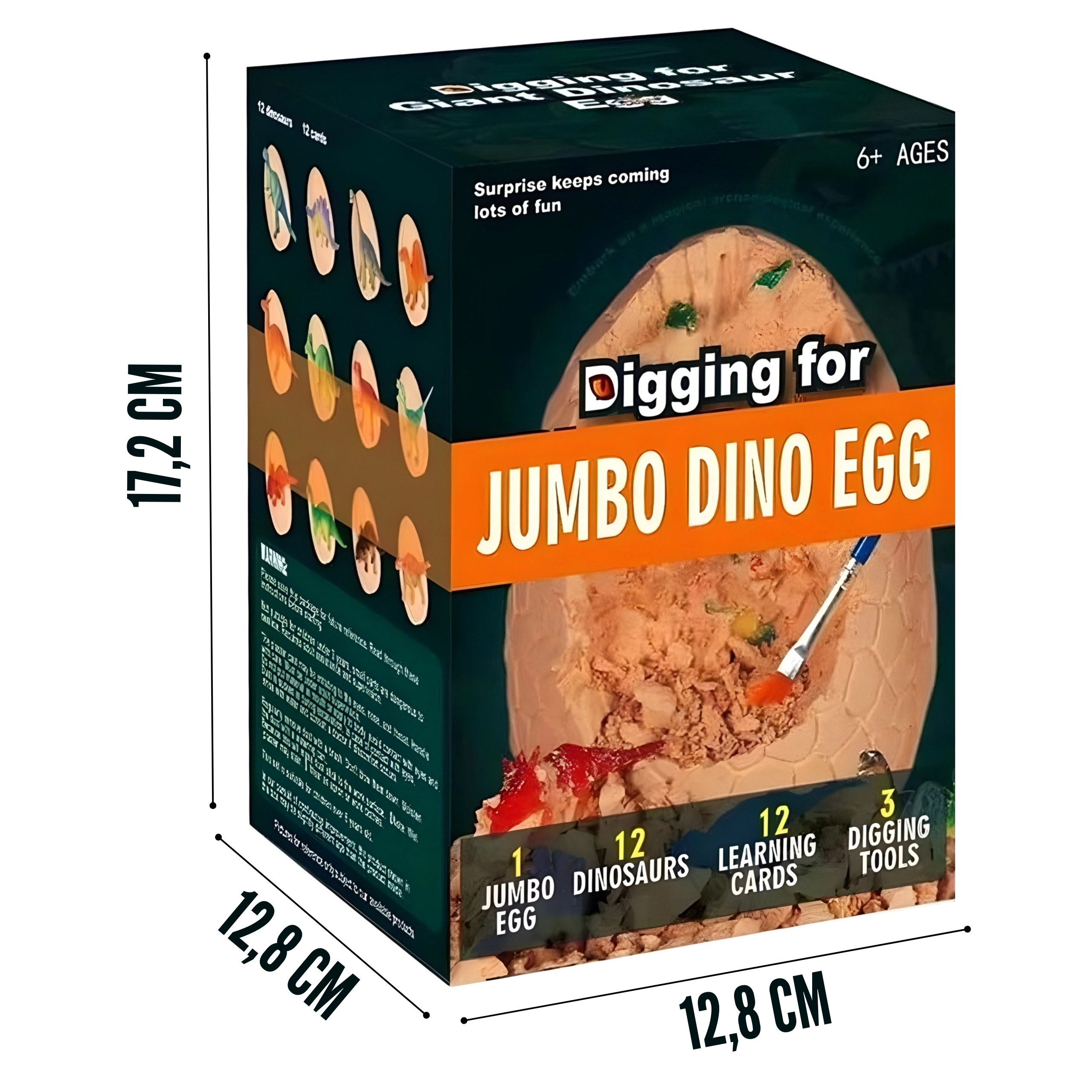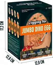 In de doos vind je alles wat je nodig hebt: een klein hamertje, beiteltje en kwastje voor veilig uitgraven, evenals 12 kaarten met beschrijvingen van dinosaurussen voor gemakkelijk leren. Een geweldig idee voor een cadeau en een activiteit voor gezellig familieplezier of om samen met vriendjes te spelen.
