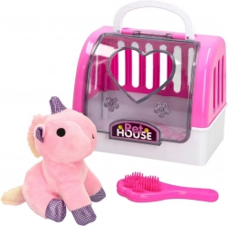 Schattige set voor kleine dierenvrienden: een draagbaar huisje met een roze pluchen eenhoorn en een verzorgingsborstel. Het kind kan zijn huisdiertje overal mee naartoe nemen – naar de kinderopvang, op een wandeling en op reis. Transparant hartvormig deurtje nodigt uit om naar binnen te kijken, praktisch handvat maakt dragen gemakkelijk en de zachte pluchen eenhoorn ondersteunt knuffelen en fantasierijk spel. Het speelgoed ontwikkelt empathie, verantwoordelijkheid en verbeeldingskracht tijdens het dagelijkse spel.