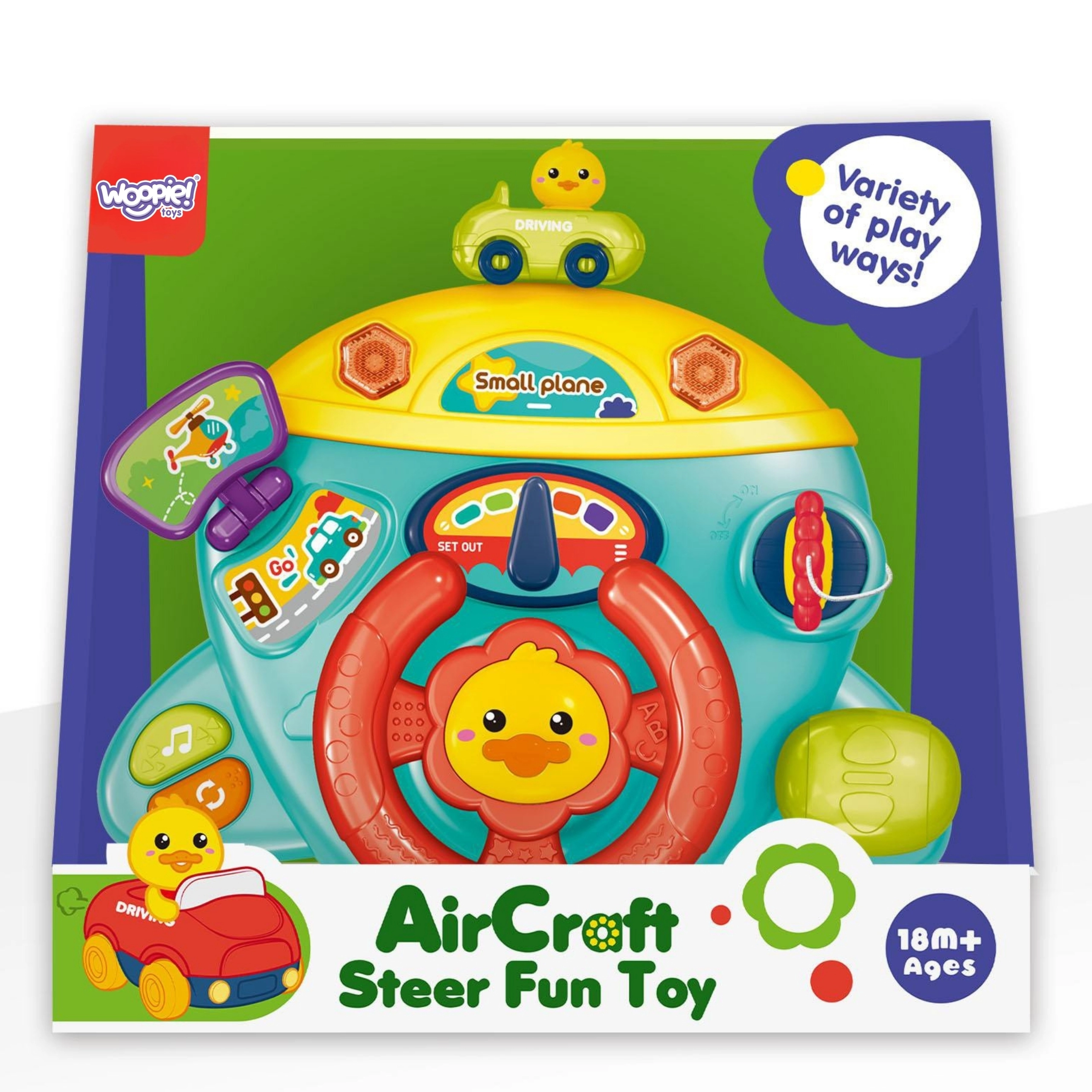 Kleine piloten kunnen het eendenstuur draaien, starten met de sleutel, het bewegende snelheidsmeter en spiegeltje volgen, terwijl het voertuig bovenop het vliegtuig over de baan naar links en rechts beweegt. Het speelgoed ondersteunt de ontwikkeling van de fijne motoriek, zintuiglijke waarneming en het leren van oorzaak-gevolg.