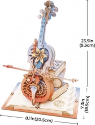 De Magische Cello is een stijlvolle houten mechanische bouwset en muziekdoos in één. Na het monteren beweegt de strijkstok sierlijk, komen de tandwielen zachtjes tot leven en draait bovenop een elegante lelie. Het geheel staat op een voet die doet denken aan open boeken – een symbool van fantasie en kunst – wat van het model een uitzonderlijke decoratie maakt voor woonkamer, studeerkamer en studentenkamer.