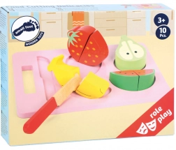 De set bevat een snijplank, een houten mes en vier soorten fruit – banaan, aardbei, peer en meloen. De hoogwaardige houten afwerking zorgt voor een lange levensduur en veilig spelen zonder scherpe randen.