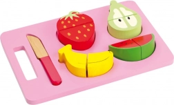 - Snijplank, houten mes, 4 soorten fruit (banaan, aardbei, peer, meloen)