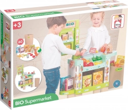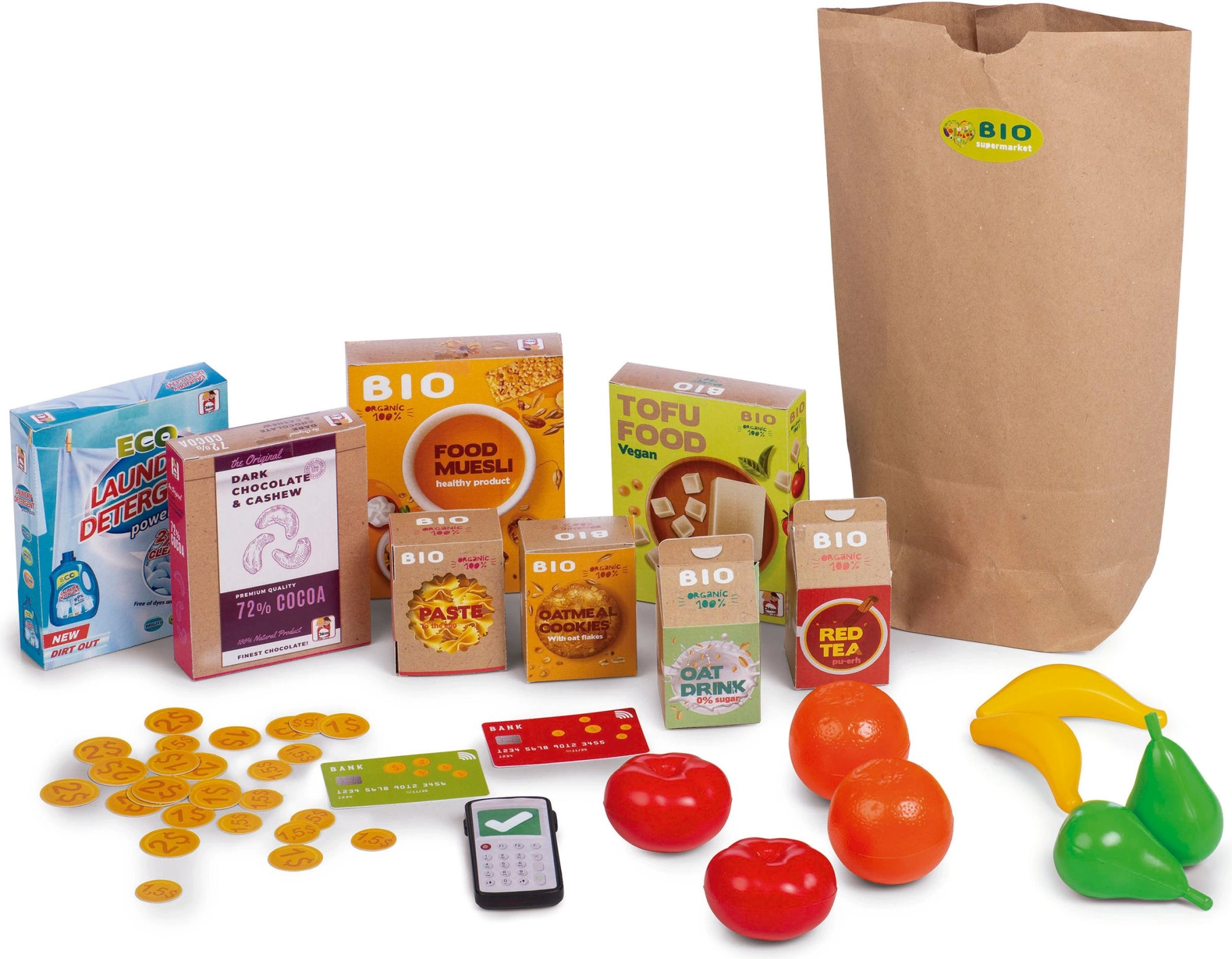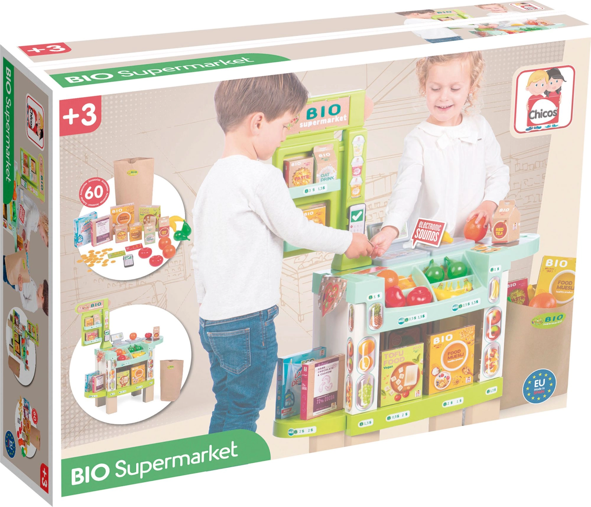De kinder-supermarkt BIO CHICOS verandert de kamer in een kleine winkel waar kinderen de rollen van verkoper en klant kunnen uitproberen. De uitgebreide set met 60 accessoires, waaronder fruit, voedseldoosjes, een scanner en een betaalterminal, ondersteunt rollenspel en bevordert communicatie, fijne motoriek en logisch denken.
