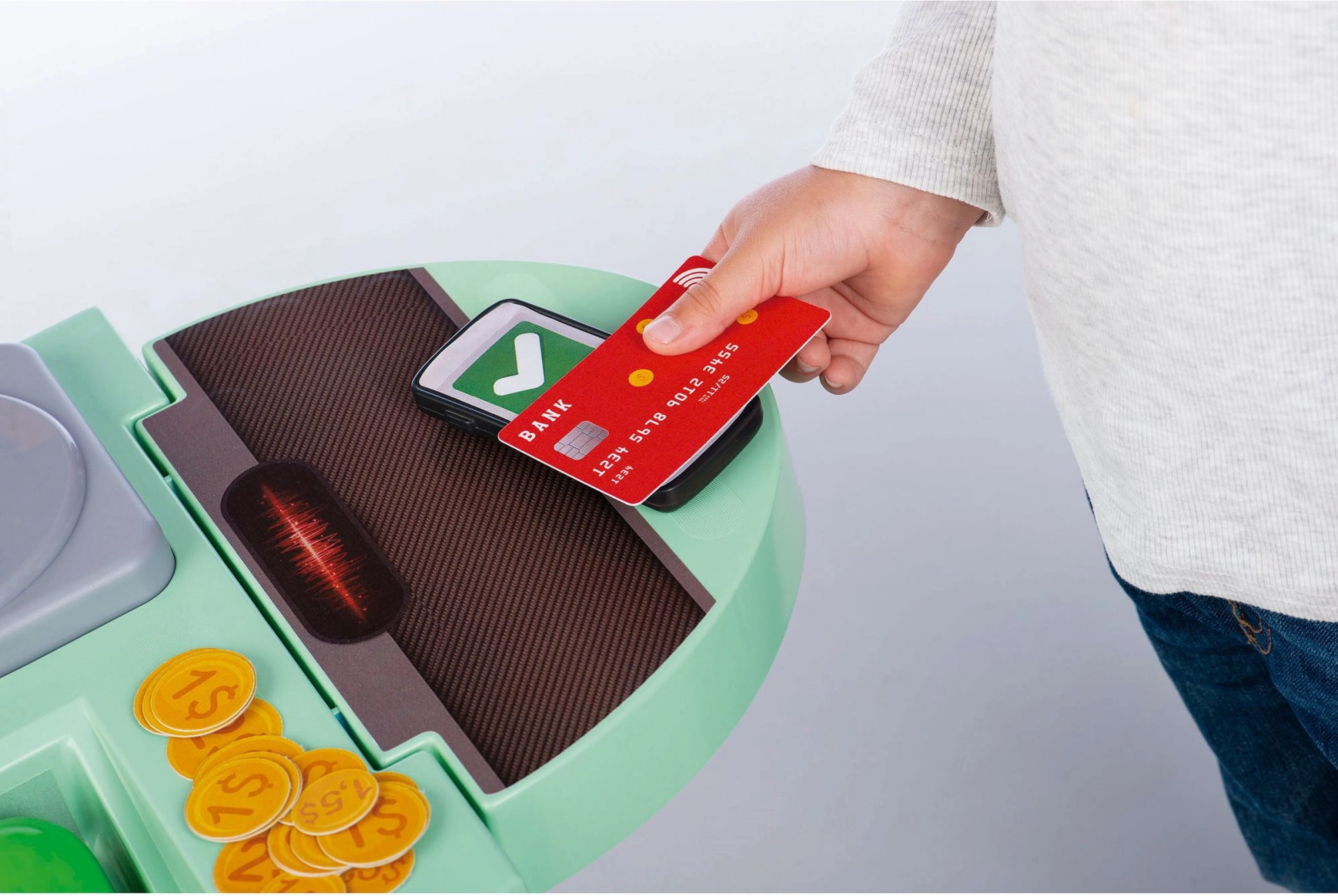 De compacte constructie met afmetingen van 78 × 59,5 × 19 cm past gemakkelijk in de meeste kinderkamers. Realistische details – schappen met prijskaartjes, een kassaband, lezer en boodschappentas – geven het spel een echte supermercadoverlay. Voor de actieve onderdelen zijn 3× LR44 nodig (niet inbegrepen in de verpakking).
