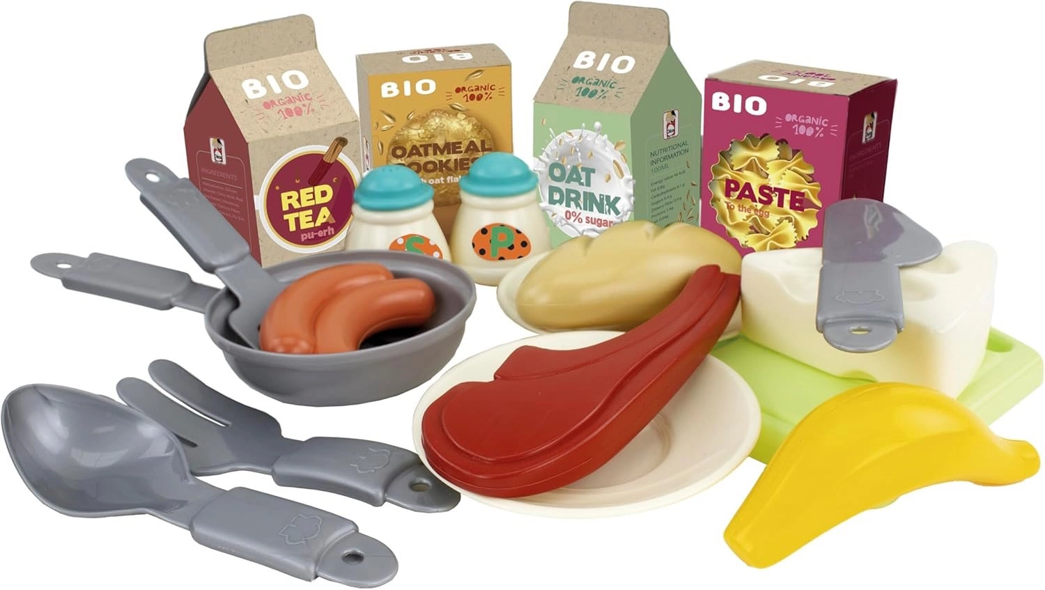 - 19-delige set – pan, borden, bestek, etenswaren en meer accessoires.