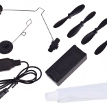 - Vliegtuig, 4× propeller, 2× horizontale stabilisator, 2× wielen, USB-kabel, afstandsbediening, tube lijm