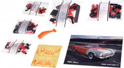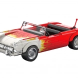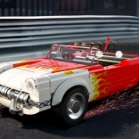 Rood-witte roadster met vlammen, open cockpit en gedetailleerde grille brengt de sfeer van klassieke Amerikaanse auto’s uit de jaren 50.