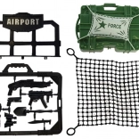 Tent/commandocentrum, kisten, radar, wapens op rails en een groot laadnet. Ideaal voor het plannen van missies en het uitbreiden van het spel.