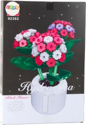 Bouw een weelderige, bloeiende hortensiabos en geef je interieur een unieke flair. De set bevat 342 hoogwaardige kunststof stukjes waarmee je bloemen in roze, witte en paarse tinten met groene bladeren maakt, geplaatst op een elegante witte basis die een bloempot imiteert. Het afgewerkte model is ongeveer 25–27 cm hoog en oogt zeer natuurlijk.
