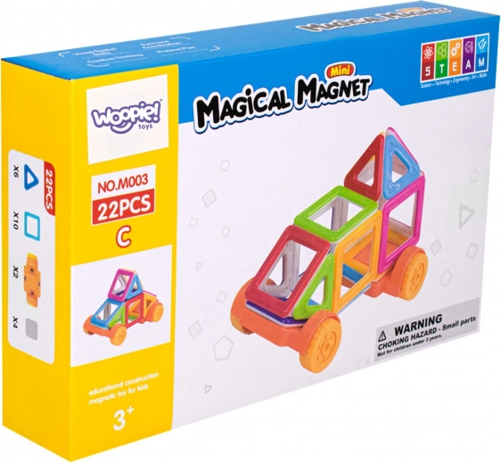 De magnetische bouwset van WOOPIE brengt kinderen op speelse wijze de basis van geometrie en magnetisme bij. Transparante, levendig gekleurde onderdelen klikken soepel aan elkaar en laten driedimensionale huisjes, torens en rijdende voertuigen ontstaan. Dankzij de sterke magnetische koppeling zijn constructies stabiel, maar toch snel om te bouwen om zo de fantasie te prikkelen.