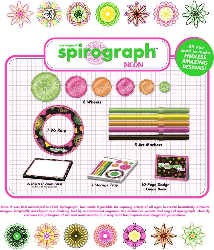 Ontdek de magie van geometrie met de Spirograaf Neon – een creatieve spirograaf-set waarmee kinderen talloze prachtige mandala’s en patronen kunnen maken. Stimuleert creativiteit, fijne motoriek en logisch denken. Dankzij de draaisjabloon-tekenset, sjablonen en getande wielen is tekenen eenvoudig en leuk. Geschikt voor kinderen vanaf 8 jaar.