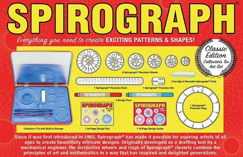 Ga terug naar de roots van het legendarische creatieve speelgoed. SPIROGRAPH Retro Tin is een stijlvolle editie in een metalen blik met een design geïnspireerd op de originele uitgave. Met de tandwielen en ringen maak je eenvoudig unieke mandala’s, ornamenten en spiraalpatronen die je daarna kunt inkleuren.