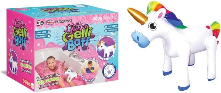 - 150 g Gelli (16 zakjes), roze glitters, 150 g reiniger/oplosser, opblaasbare eenhoorn van 30 cm
