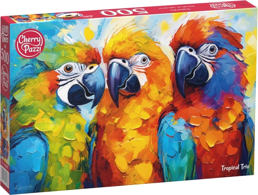 Ontdek het plezier van puzzelen met Cherry Pazzi, bekend om de precieze stans en hoogwaardige druk. Het motief Tropisch trio zal zowel natuurliefhebbers als iedereen die een kleurrijke en positieve afbeelding aan de collectie wil toevoegen, bekoren.