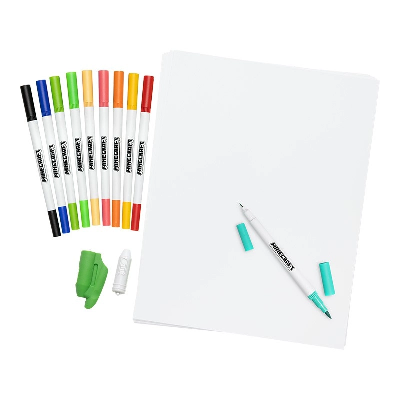De set bevat lichte, dubbelzijdige markers met een fijne en een bredere punt voor precieze lijnen en vloeiende arceringen. Ideaal voor schetsen, overtrekken en het inkleuren van Minecraft-motieven.