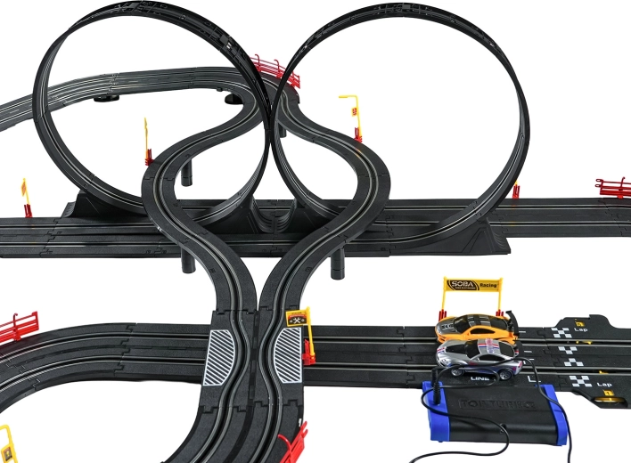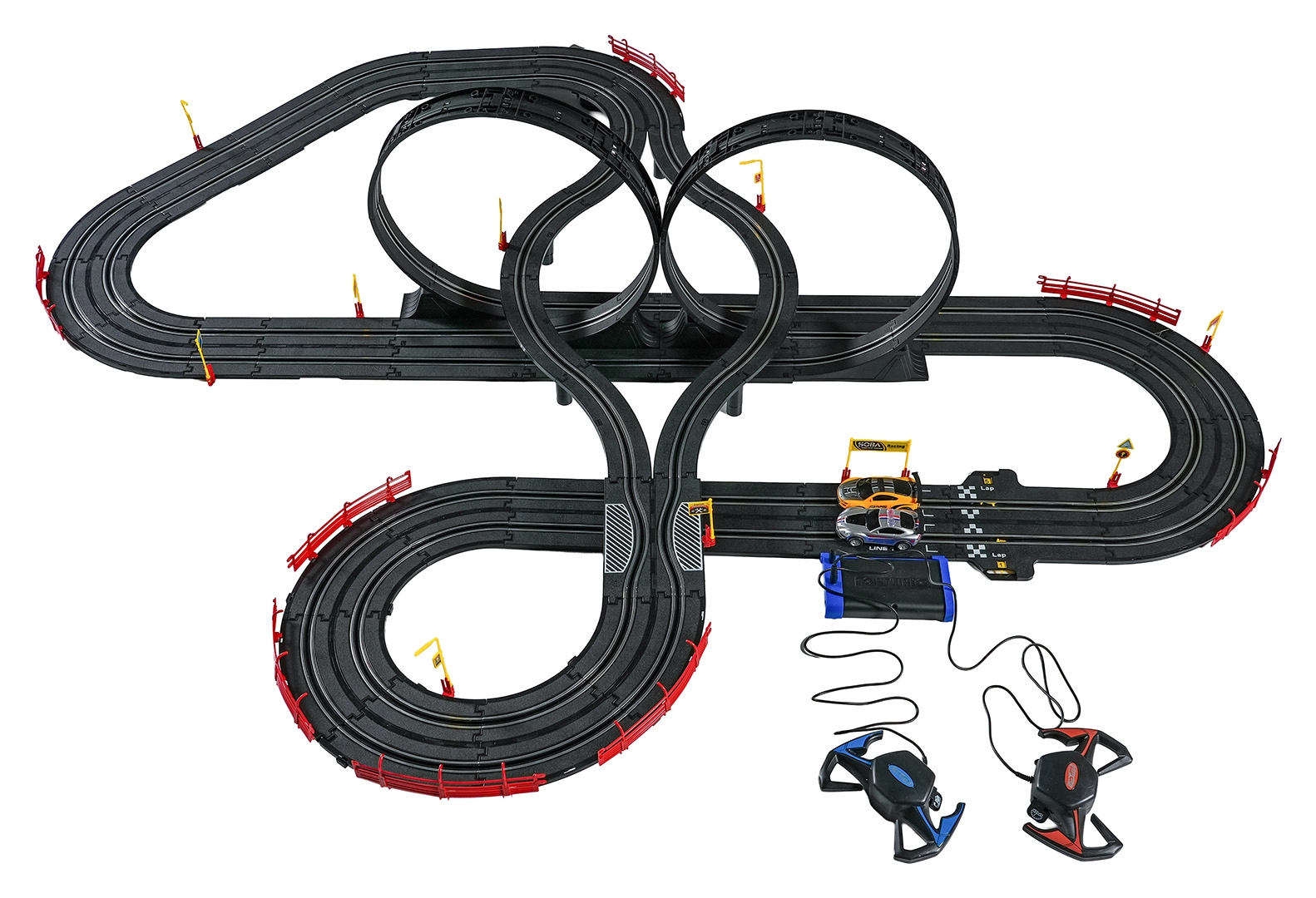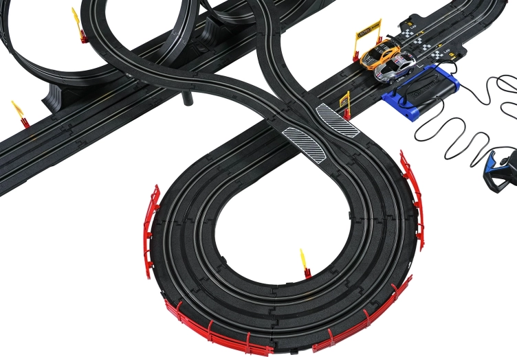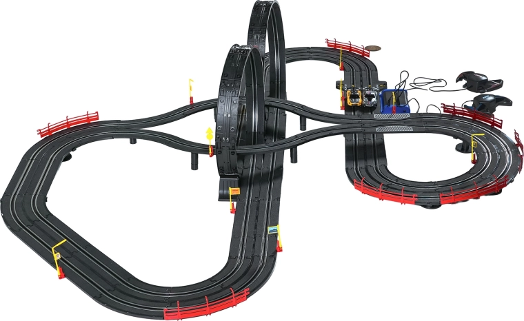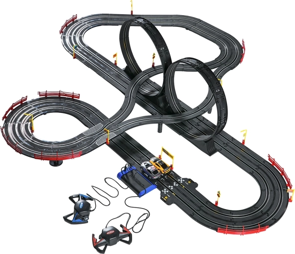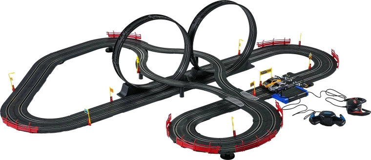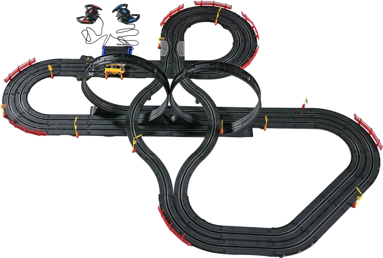 Gigantische elektrische racebaan voor twee spelers met een lengte tot 790 cm, met dubbele loopings, scherpe bochten en lange rechte stukken voor spannende duels. In de verpakking zitten 2 raceauto’s met lichteffecten en 2 controllers in de vorm van een stuur. De baan kan worden gevoed via de 12 V-adapter (inbegrepen) of met batterijen, zodat je altijd en overal kunt racen.