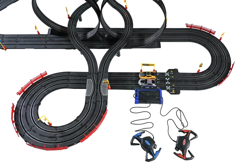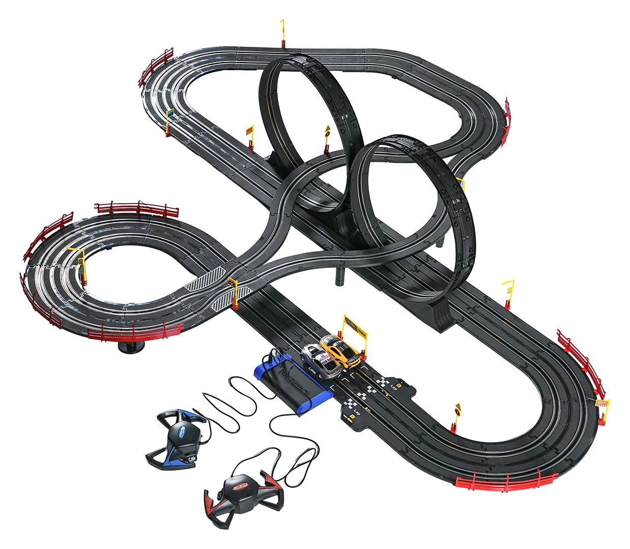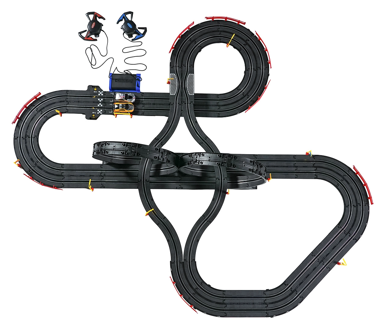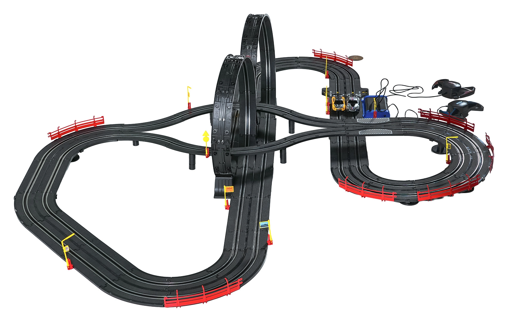 Gigantische elektrische racebaan voor twee spelers met een lengte tot 790 cm, met dubbele loopings, scherpe bochten en lange rechte stukken voor spannende duels. In de verpakking zitten 2 raceauto’s met lichteffecten en 2 controllers in de vorm van een stuur. De baan kan worden gevoed via de 12 V-adapter (inbegrepen) of met batterijen, zodat je altijd en overal kunt racen.