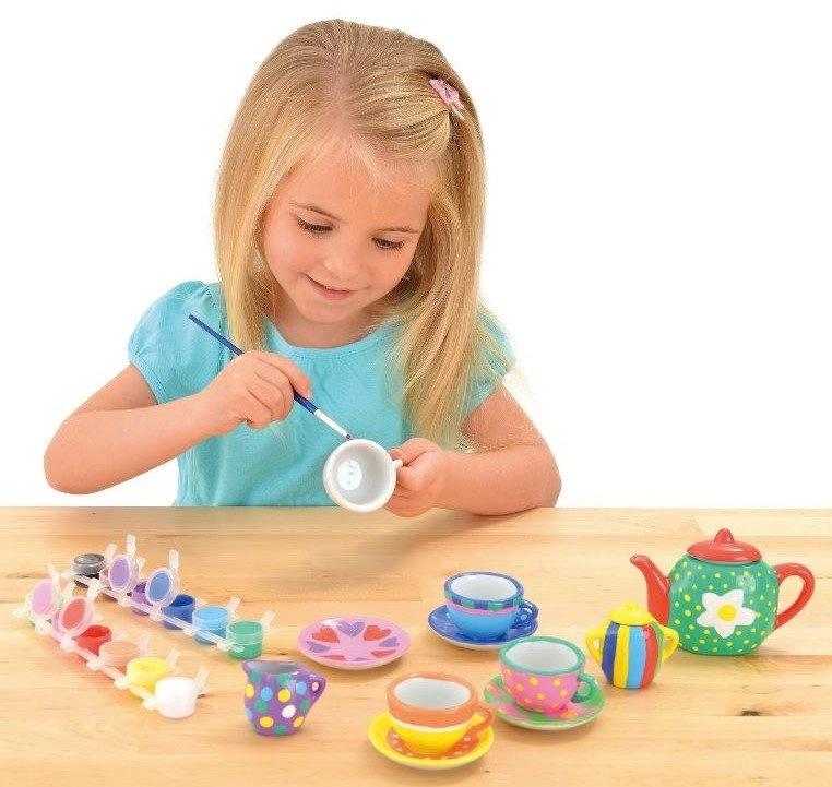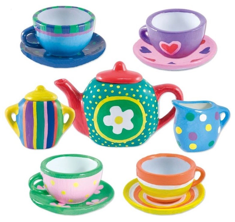 De set bevat een theepot, 4 kopjes met schoteltjes, een suikerpot en een melkkannetje – ideaal voor creatief knutselen en vervolgens spelen met thee om vijf uur.