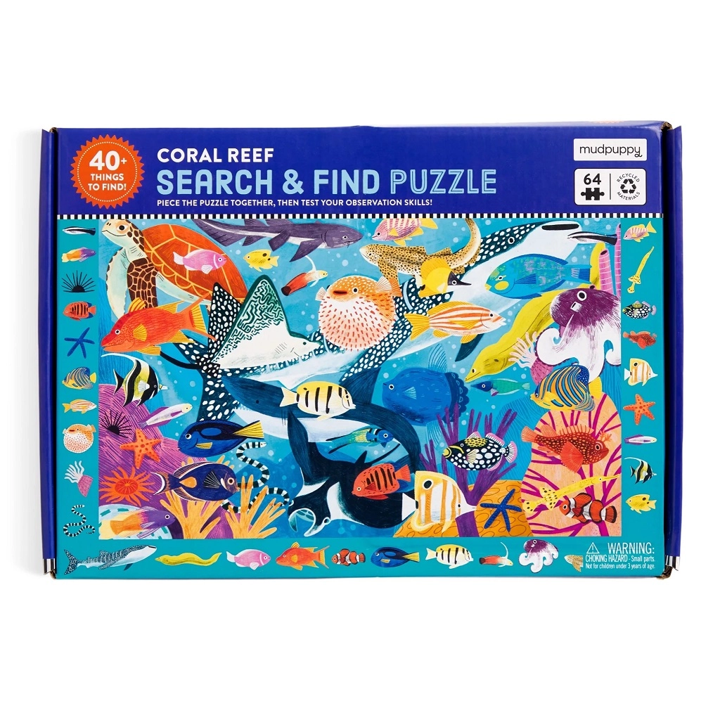 Ontdek de magie van de onderwaterwereld met de Mudpuppy-puzzel Koraalrif. Na het leggen van 64 stukjes oefenen kinderen én volwassenen hun concentratie en fijne motoriek door meer dan 40 zeedieren te zoeken rondom de afbeelding. De puzzel is gemaakt van FSC-gecertificeerd, gerecycled karton en wordt geleverd in een stevige, cadeaubox.