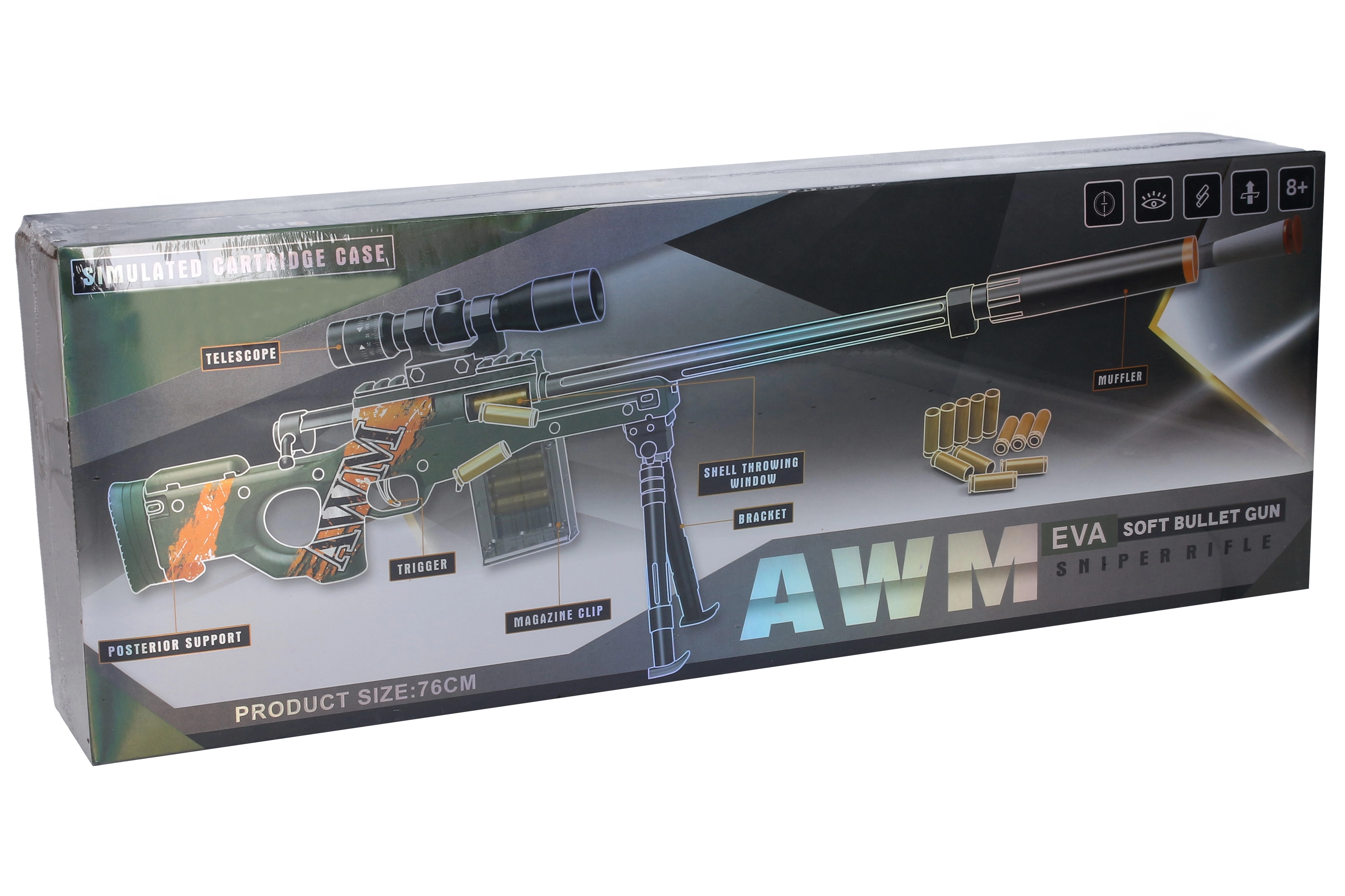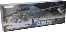 Realistisch kindergeweer geïnspireerd op het AWM-model dat kleine fans van actiegames zal verrassen. Het biedt een demontabele constructie, een lengte van 76 cm, een standaard, een demper en een vizier voor beter richten. De verpakking bevat 10 patronen en 10 foamkogels. Op de achterkant van de doos vindt u een stapsgewijze handleiding met afbeeldingen voor montage en gebruik.