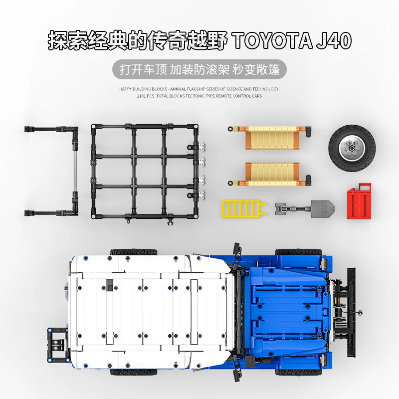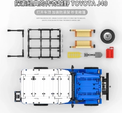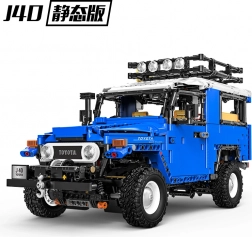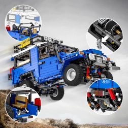 Groot bouwpakket van een terreinwagen op schaal 1:12 voor kinderen vanaf 8 jaar met 2101 stukjes voor uren speelplezier. Het blauwe model valt op door de gedetailleerde afwerking en functies zoals openslaande deuren, motorkap en kofferbak. Voorzien van rubberen banden en een sterke, duurzame constructie.