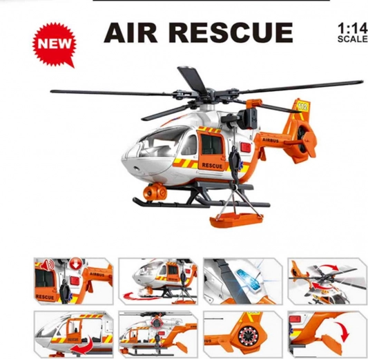 Kinderen zullen de openende zijdeur en achterklep, de bewegende haak met transportmand en de inklapbare en draaibare rotors waarderen. LED-verlichting aan de voorkant, bovenop en in de cockpit, samen met authentieke vlucht- en alarmgeluiden, versterken de sfeer van reddingsacties. De helikopter wordt gevoed door 2× AAA-batterijen (meegeleverd).