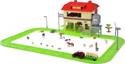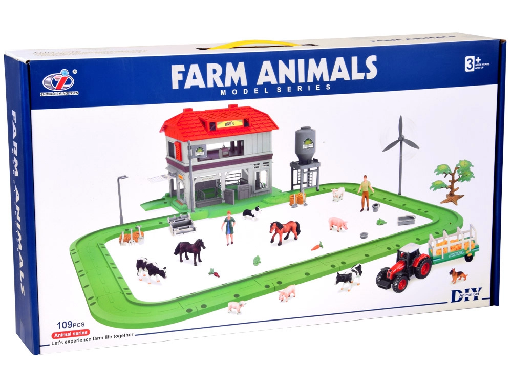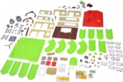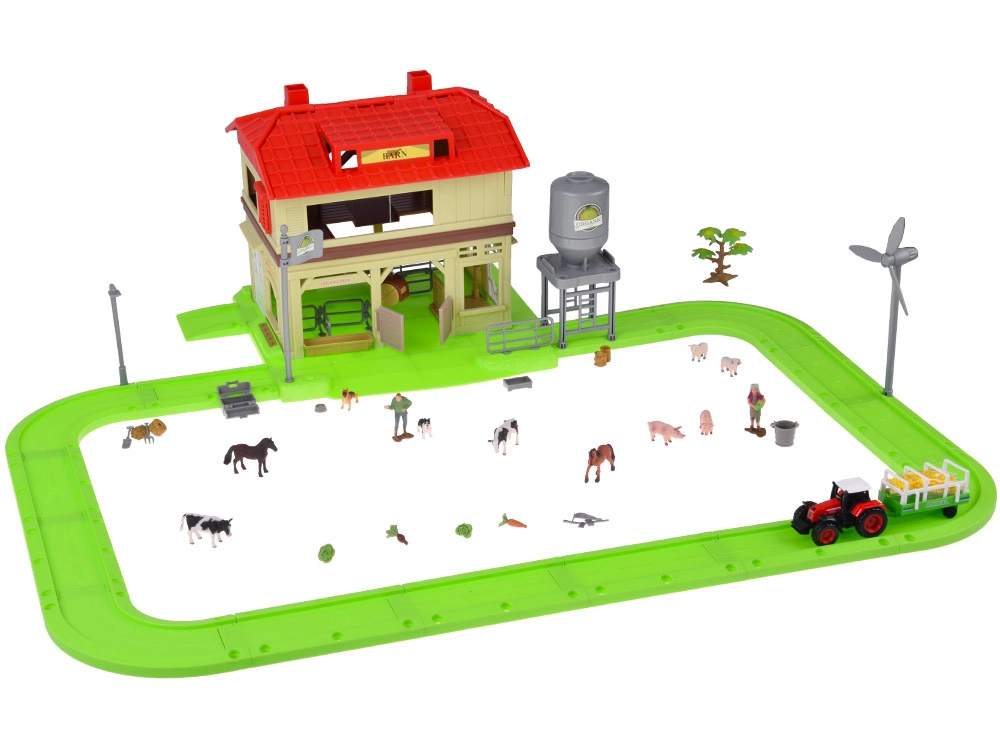 Deze complete set tovert de kinderkamer om tot een klein platteland. Kinderen kunnen dieren voeren, hooi vervoeren met de tractor met aanhanger, het schuurdak openen voor gemakkelijke toegang en de silo gebruiken om voer in en uit te laten stromen. De groene baan/circuit verbindt alle onderdelen van de boerderij tot één speelse scène.