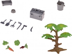 - Gereedschap (schep, riek, bijl, hak), emmer, kist, containers, groenten, hooi
