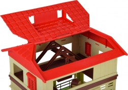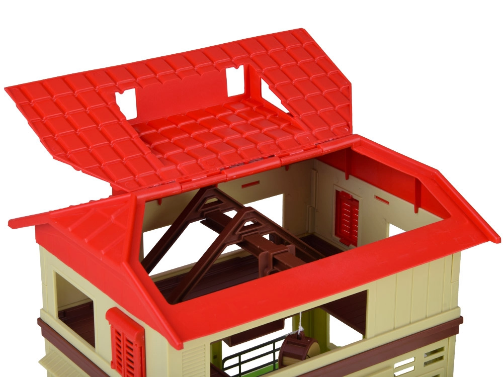 De schuur met rood dak kan worden geopend voor het eenvoudig inrichten van het interieur. Een draaikrukje voegt authenticiteit toe en stimuleert de fijne motoriek.